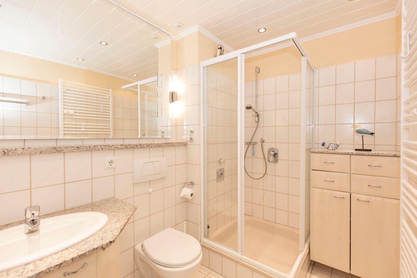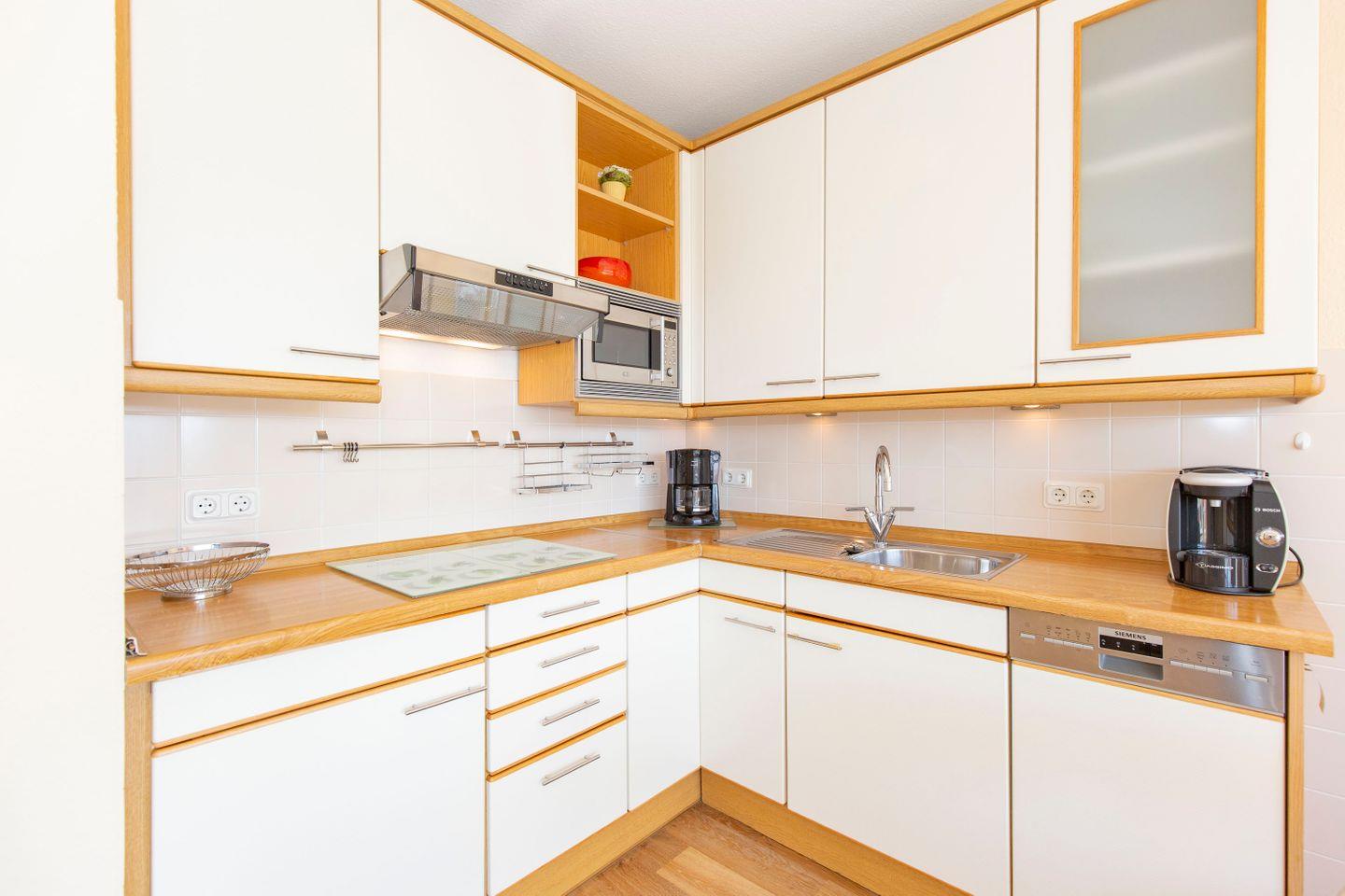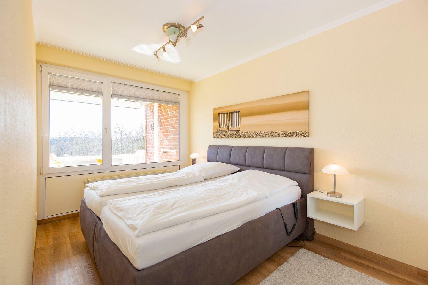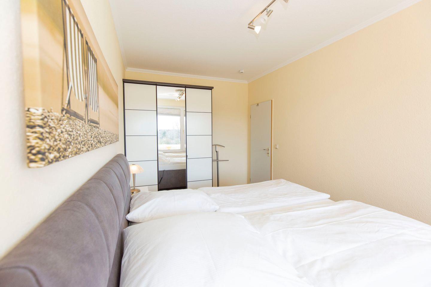 Haus "Trafalgar", Typ B, Appartement-Nr. 244, bis 2 Pers., 2.Etage, ca. 46 qm, Südseite (ohne Seesicht), Schlafzimmer mit Doppelbett, Wohnbereich mit Sofa und Relax-Sessel, Küchenzeile mit 4-Platten-Ceranfeld, Geschirrspüler und Mikrowelle, Dusche/WC, Fön, Balkon, Kabel-TV, kostenloser W-Lan Zugang im App. Tiefgaragenstellplatz, Nichtraucherwohnung, Strandkorb in den Sommermonaten 2026.