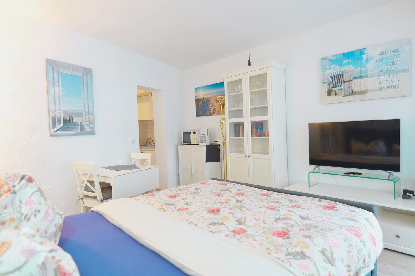 Der kombinierte Wohn- und Schlafbereich ist praktisch und gemütlich eingerichtet. Dich erwarten ein bequemes Bett, ein Esstisch, TV sowie kostenfreies WLAN.
