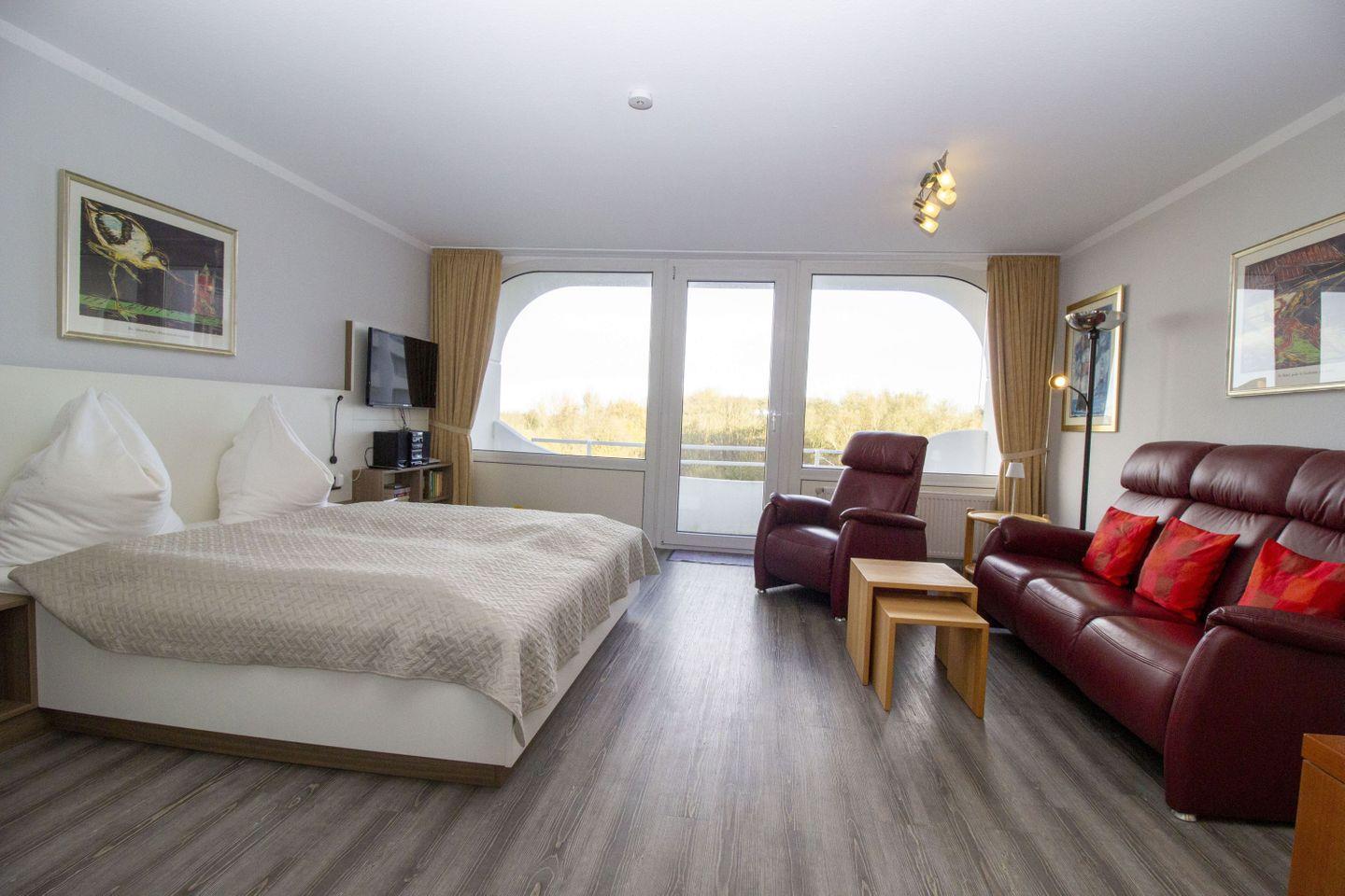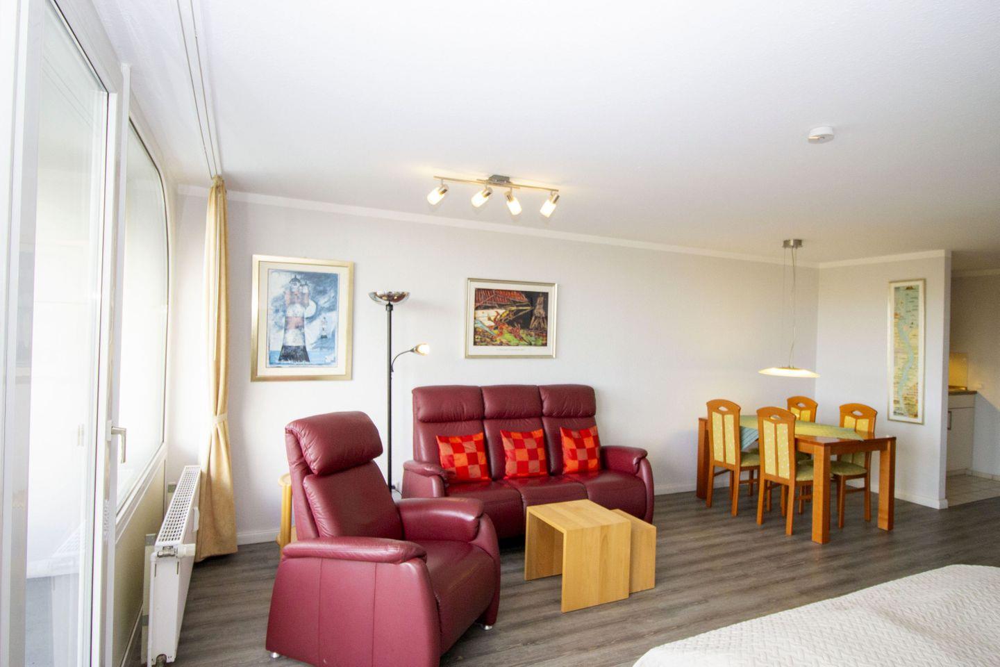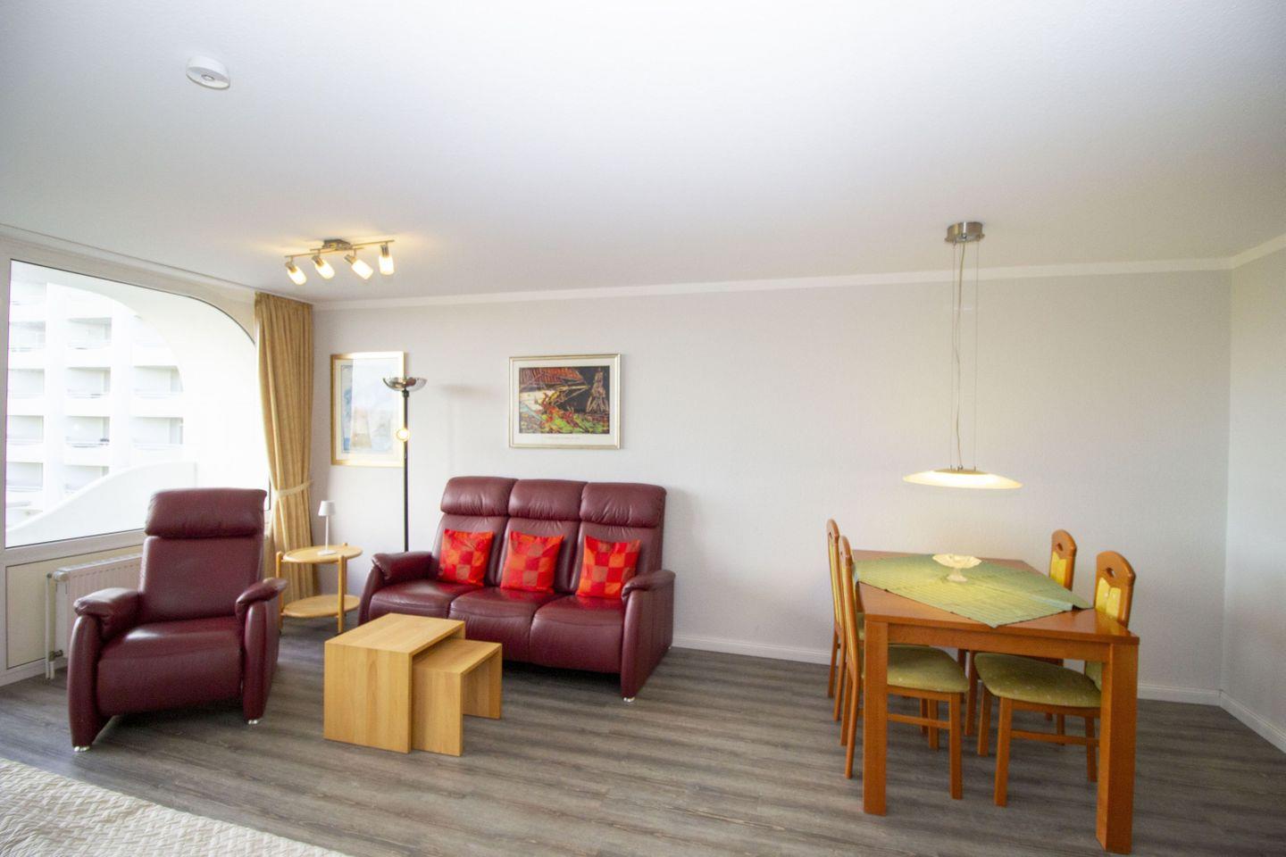Haus "Trafalgar", Typ C, Appartement-Nr. 334, bis 4 Personen, 3.Etage, ca. 55 qm, Nordseite, Wohn/Schlafraum mit Doppelbett, separates Schlafzimmer mit zwei Einzelbetten (innenliegend), Küchenzeile mit Mikrowelle, 2-Platten-Ceranfeld, Geschirrspüler, Dusche/WC, Balkon, Kabel-TV, kostenl. WLAN-Zugang im App., Tiefgaragenstellplatz, Nichtraucherappartement, keine Haustiere erlaubt, Strandkorb im Sommer 2026.