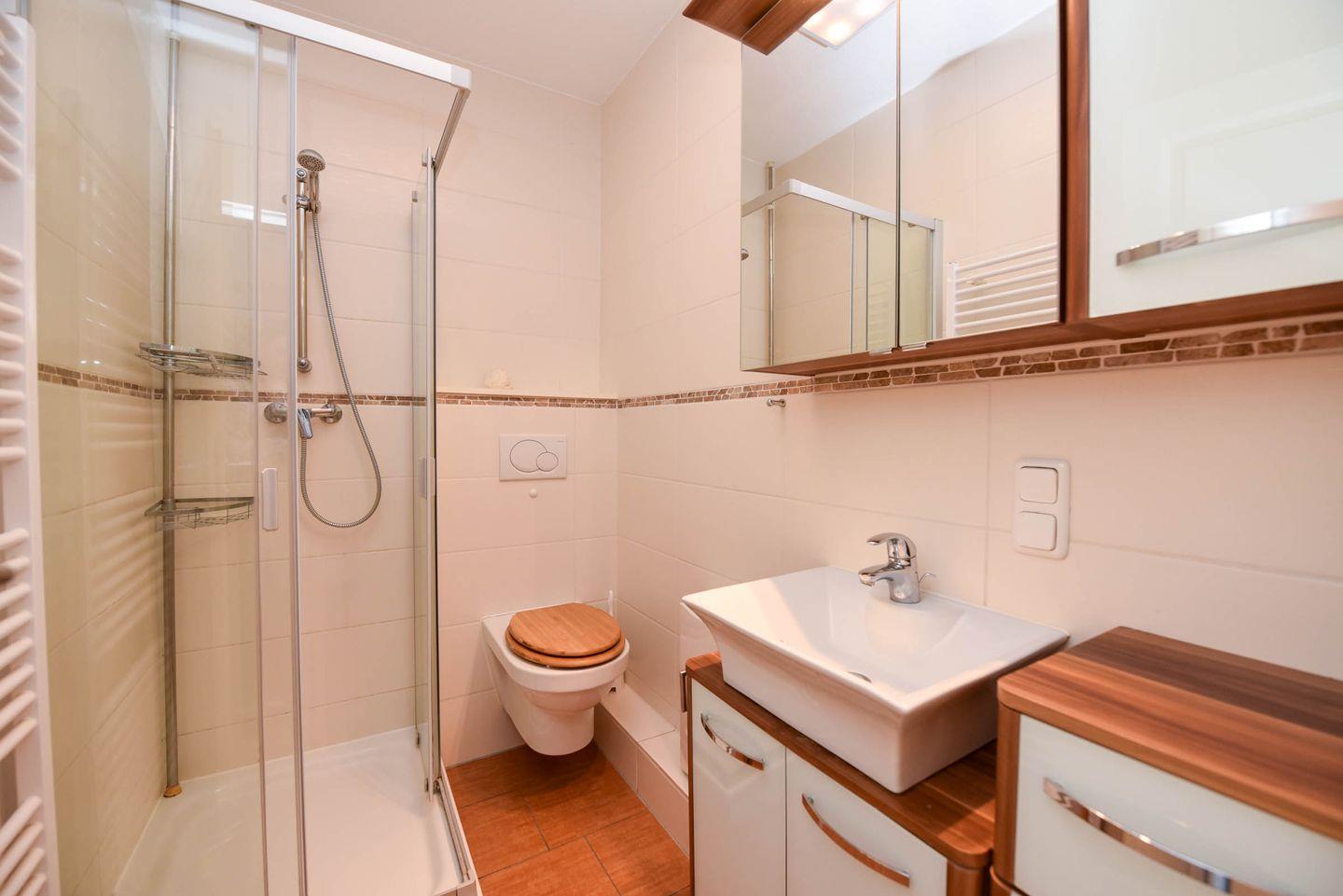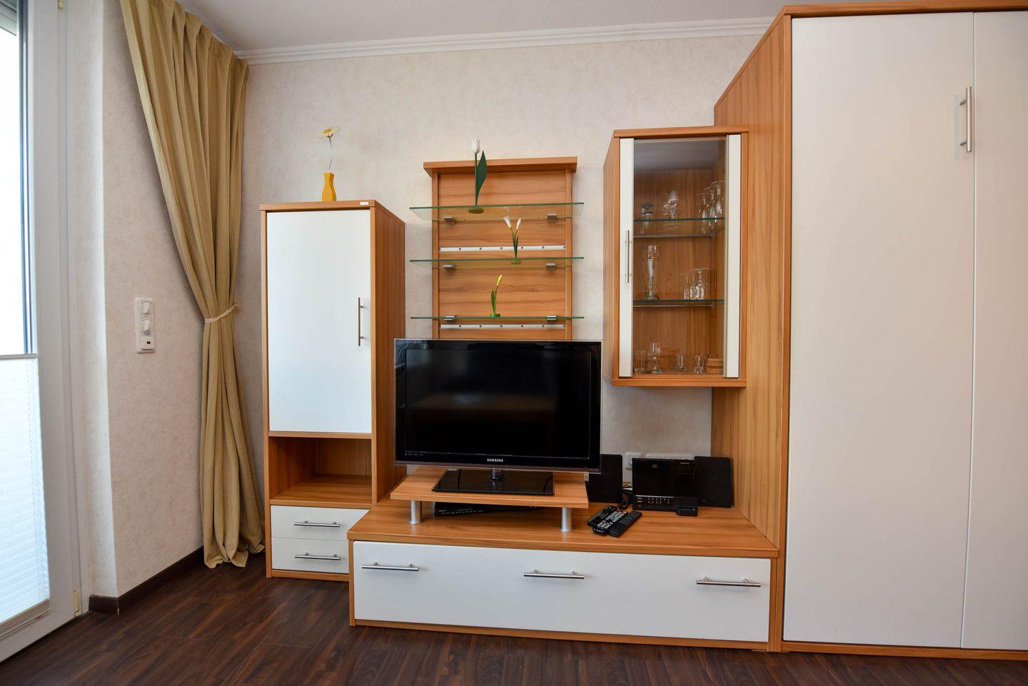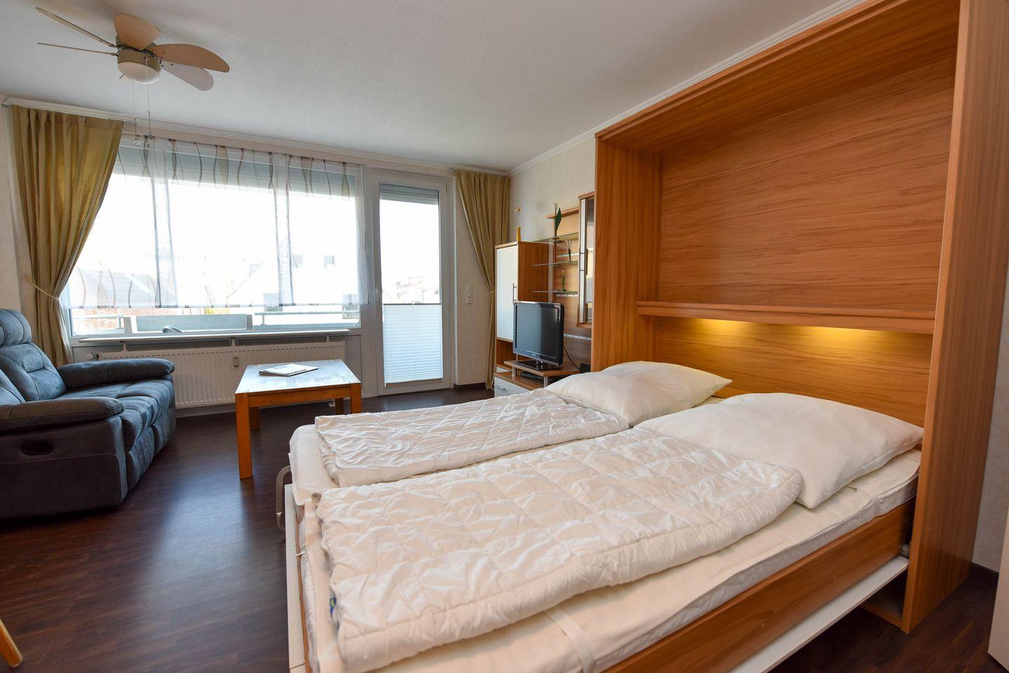 Der kombinierte Wohn- und Schlafbereich ist mit einem komfortablen Schrankklappbett ausgestattet und ideal für 2 Personen. Eine gut ausgestattete Küchenzeile mit Kühlschrank, Spülmaschine, Mikrowelle, Elektrokochfeld, Kaffeemaschine, Wasserkocher und ausreichend Geschirr ermöglicht die Selbstversorgung. Das moderne Duschbad rundet die Ausstattung ab.