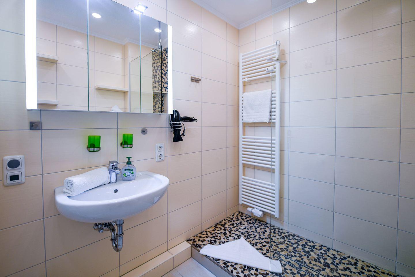 Die helle Ferienwohnung verfügt über eine moderne, offene Küche, einen gemütlichen Wohn- und Essbereich sowie eine große verglaste Südfensterfront zum Öffnen. Das neue Bad mit bodengleicher Flachdusche und Radio sorgt für zusätzlichen Komfort.