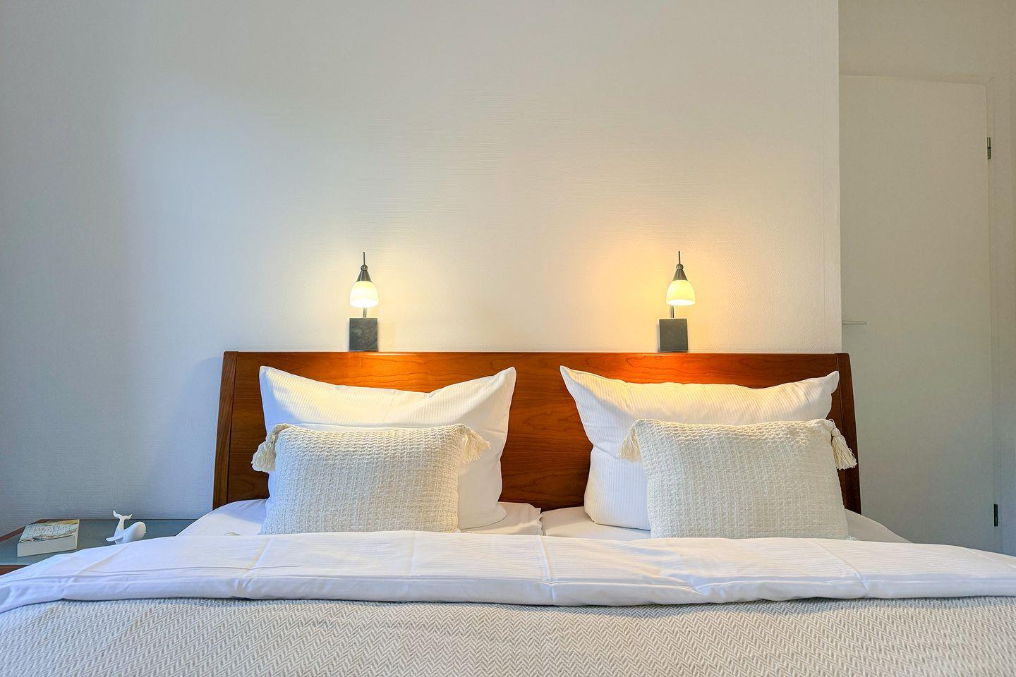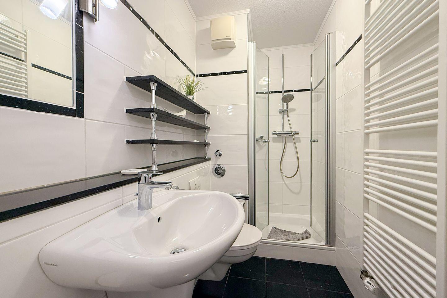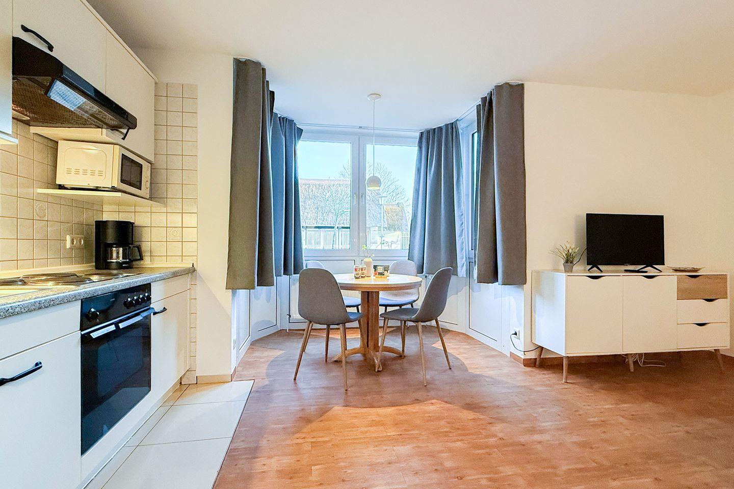 Die offene Küche ist direkt an den Wohnraum angebunden und bestens für deine Selbstversorgung ausgestattet. Dir stehen ein Herd mit 4-Platten-Kochfeld und Elektro-Backofen, Mikrowelle, Kühlschrank mit Gefrierfach sowie Kaffeemaschine, Wasserkocher, Toaster und Eierkocher zur Verfügung. Natürlich sind auch Küchenutensilien, Geschirr und Besteck vorhanden. Für längere Aufenthalte besonders praktisch: Waschmaschine und Trockner können gemeinschaftlich genutzt werden, ein Wäscheständer und ein Ganzkörperspiegel stehen ebenfalls bereit. Heizung und Rauchmelder sorgen für zusätzlichen Komfort und Sicherheit.