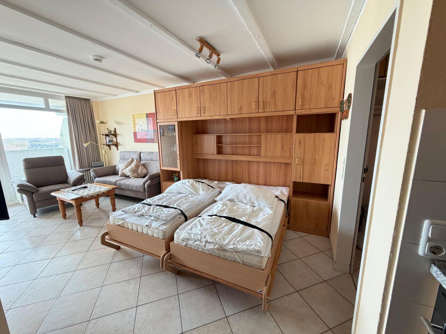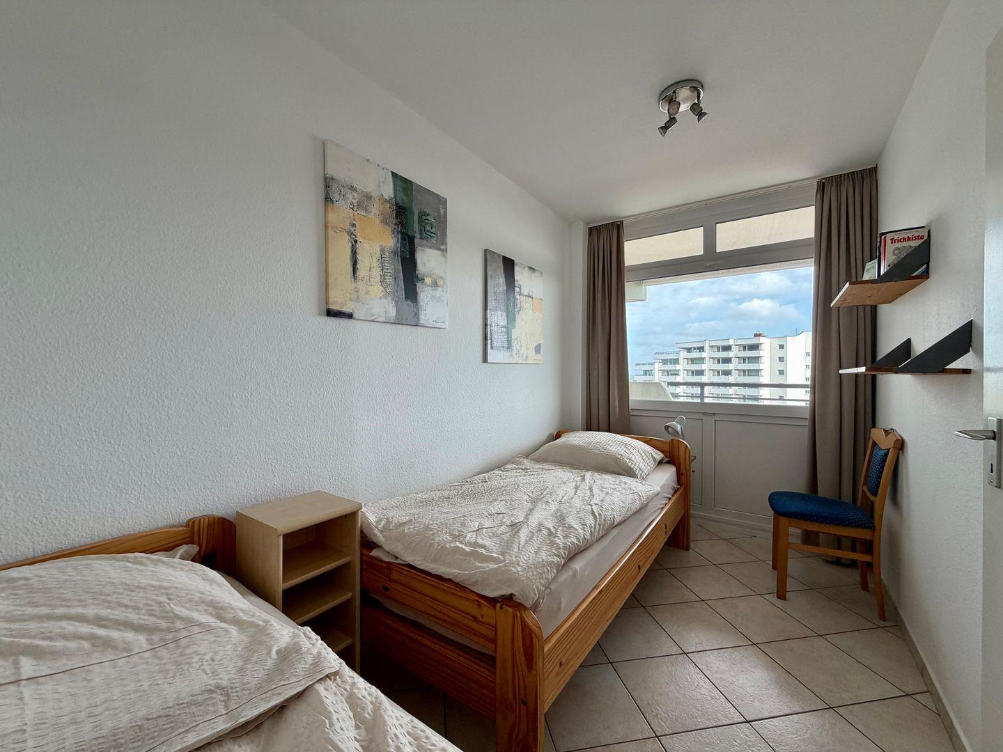Die Ferienwohnung Nr.80 im 5.OG.48qm mit Blick zur Elbeinfahrt hat einen Schlafraum mit 2 Einzelbetten und ein Schrank-Doppelbett mit Federkernmatratzen.