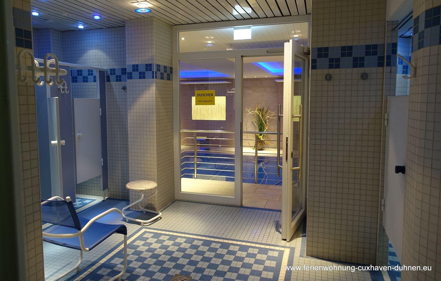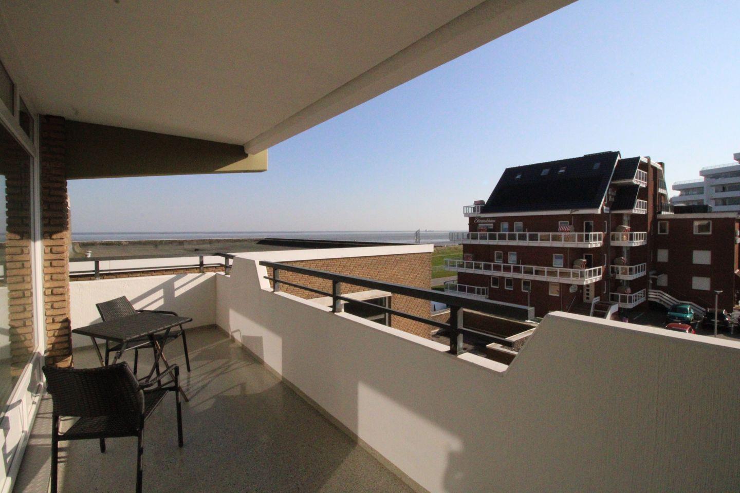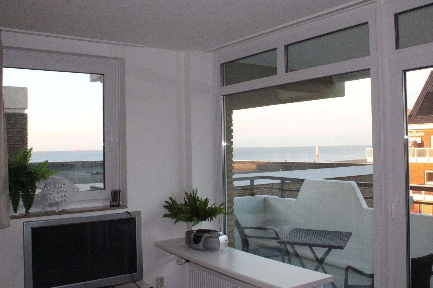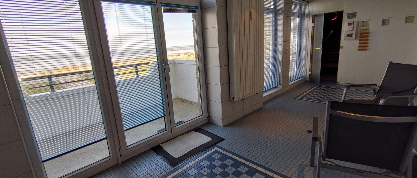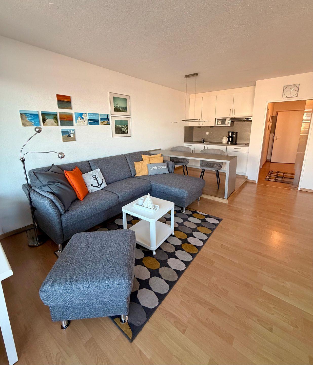 Komfortables Apartment (46 m²) in bester Lage direkt an der Duhner Strandstraße in Cuxhaven, ideal für zwei Personen. Die Wohnung liegt im 2. Obergeschoss mit Aufzug. Heller Wohnbereich mit neuem, bequemem Ecksofa. Offene Küche auf Podest, sodass man bereits vom Esstisch auf das Wasser bzw. Meer schauen kann. Möblierter Balkon mit seitlichem Meerblick, Strand ca. 50 m entfernt. Pool, Sauna und Garagenstellplatz im Haus.