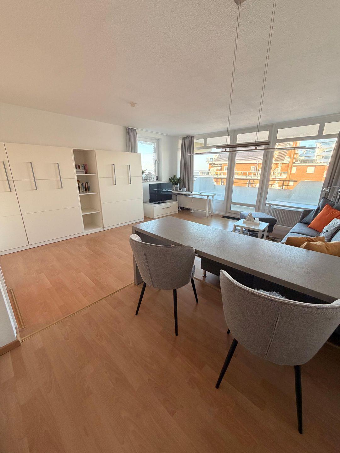 In hervorragender Lage direkt an der Duhner Strandstraße in Cuxhaven erwartet Sie dieses stilvolle Apartment mit 46 m² Wohnfläche, ideal für einen erholsamen Aufenthalt zu zweit. Die Wohnung liegt im 2. Obergeschoss eines gepflegten Hauses mit Aufzug.