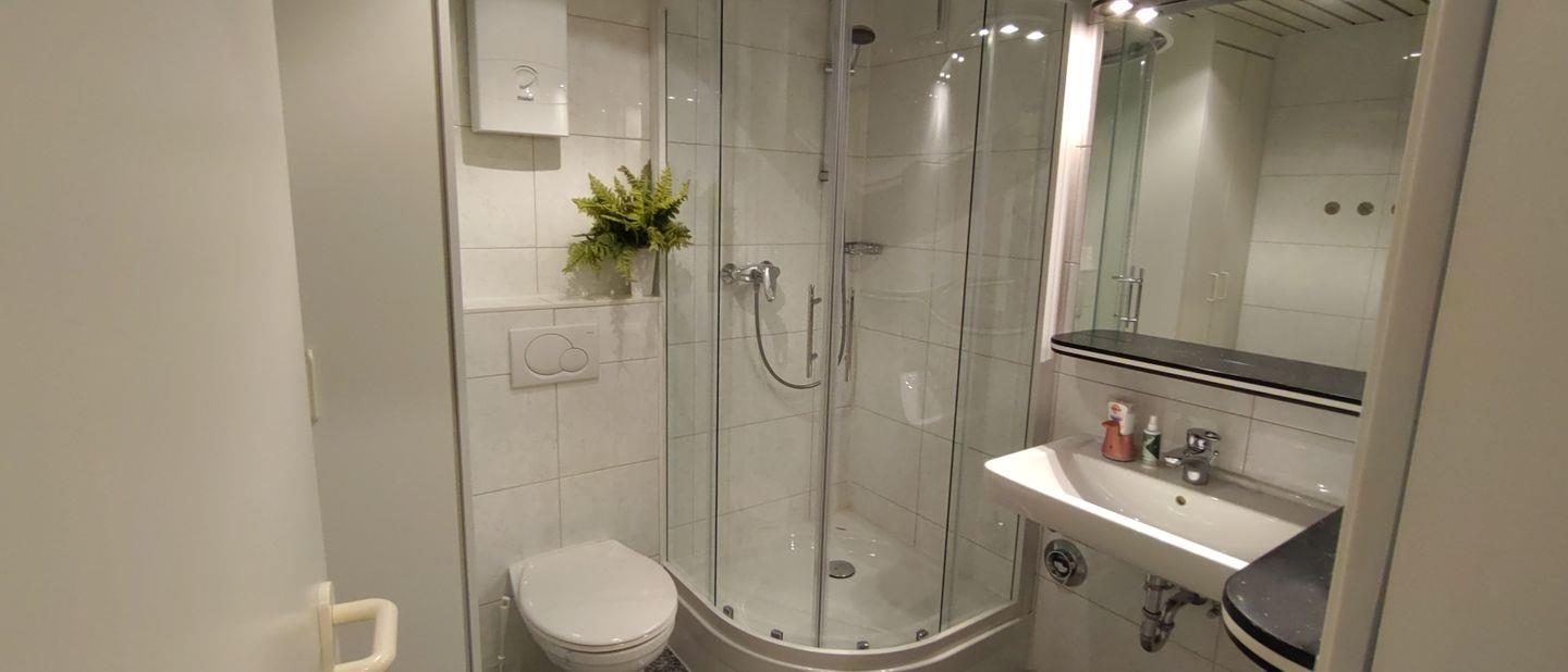 Das Badezimmer verfügt über Dusche, WC, Waschbecken, Kosmetikspiegel und Haartrockner.