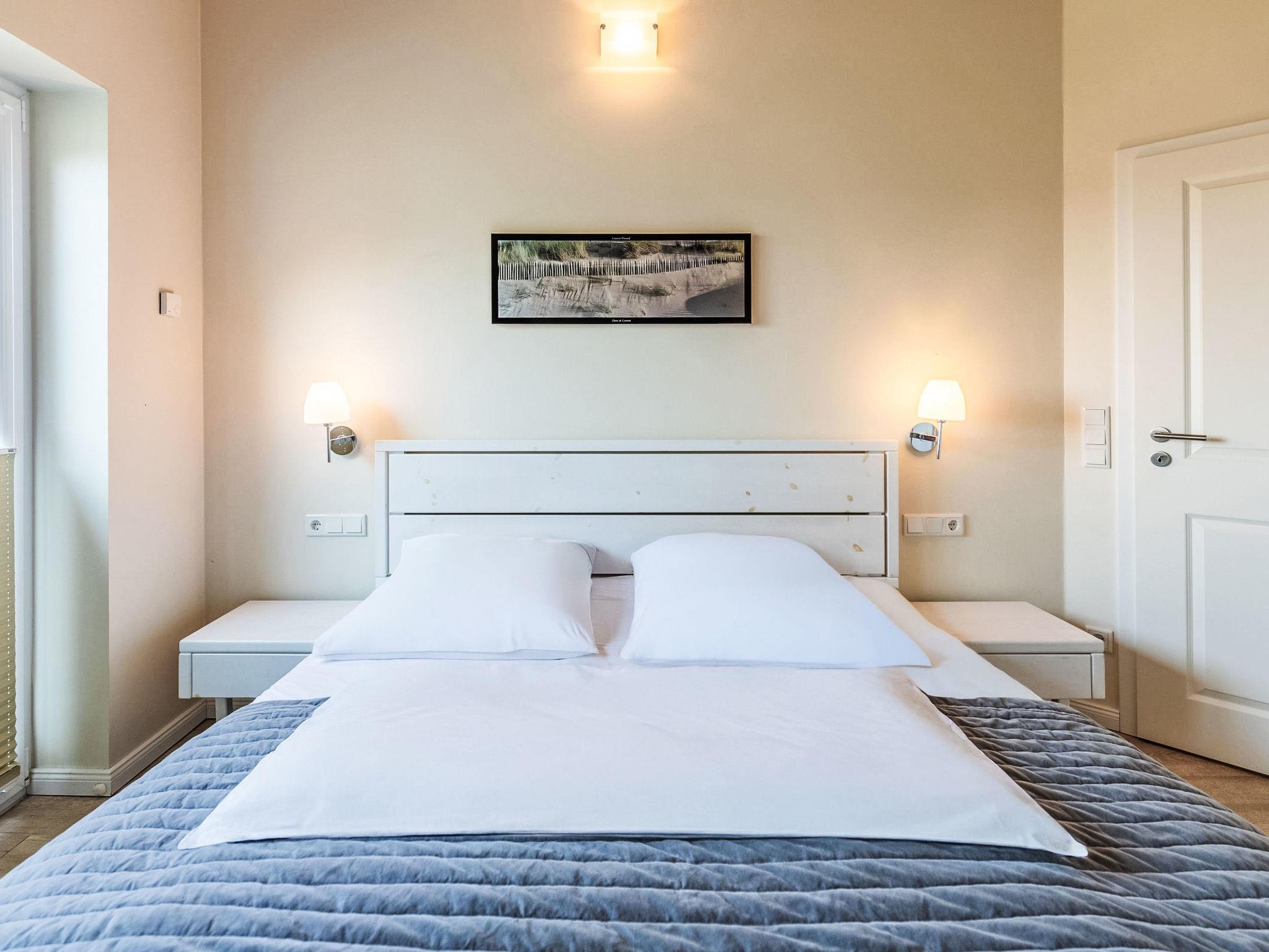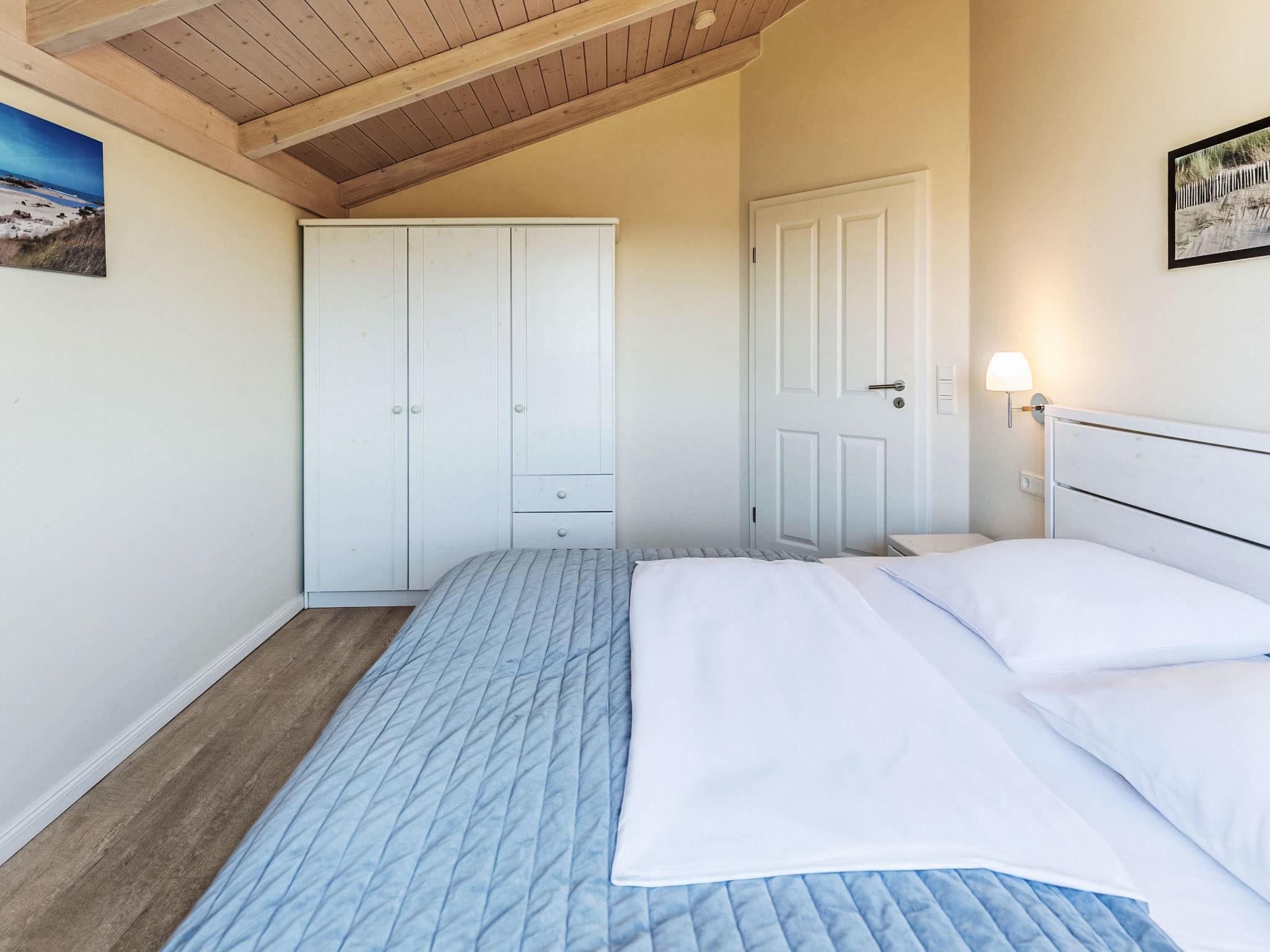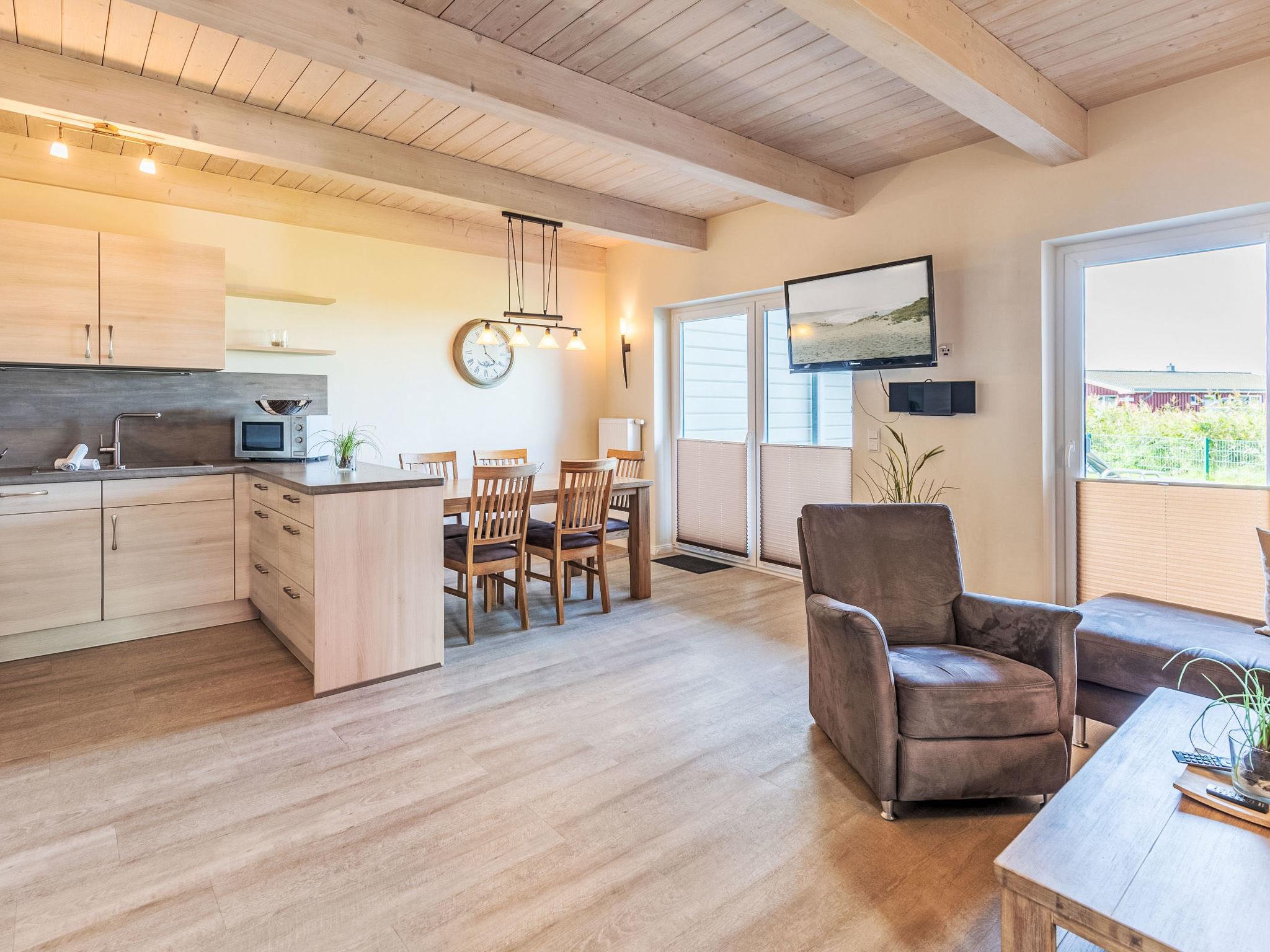 "Meeresbrise", 4-room terraced house 100 m2 on 2 levels. Comfortable and tasteful furnishings: living/dining room with Scandinavian wood stove and satellite TV (flat screen), radio and CD-player. Exit to the terrace. 1 room with 1 bed. Open kitchen (oven, dishwasher, 4 ceramic glass hob hotplates, toaster, kettle, microwave, freezer, electric coffee machine). Shower/WC. Upper floor: 2 rooms, each room with 1 double bed (180 cm, length 200 cm). Sep. WC, bath/shower/WC, Sauna. Balcony, terrace, lawn. Terrace furniture, barbecue (portable), deck chairs (2). Facilities: safe, children's high chair, hair dryer. Internet (WiFi, free). Parking (2 cars) at the house. Please note: non-smoking house. Smoke alarm.