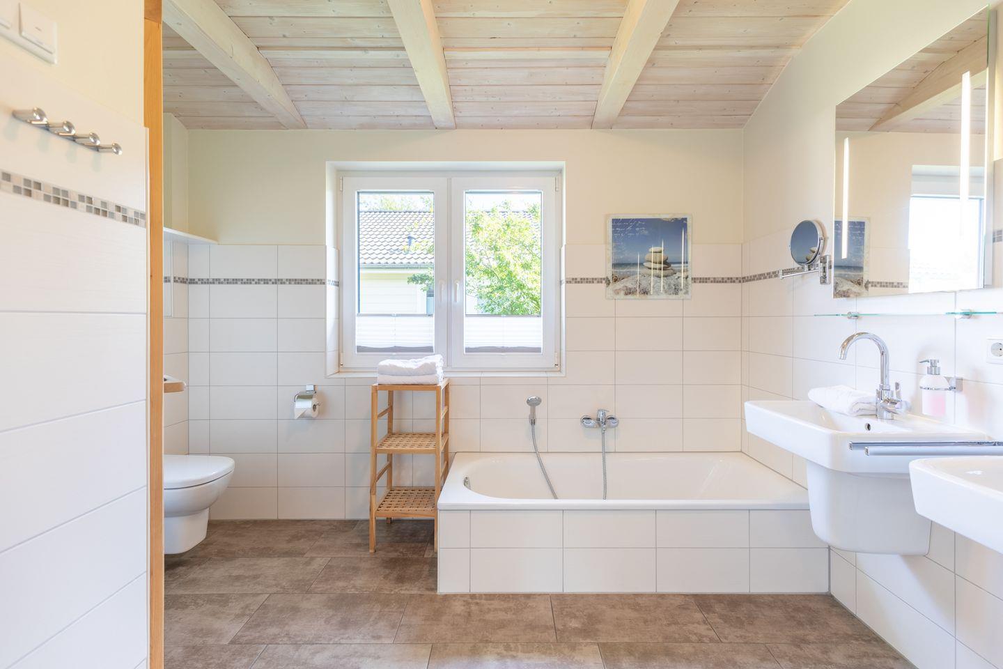 Das 85 qm große Ferienhaus ist modern und exklusiv im skandinavischen Charme eingerichtet. Die zwei Schlafzimmer mit jeweils einem Komfort-Doppelbett (180 × 200 cm) bieten Platz für bis zu vier Personen. Das gemütliche Wohnzimmer ist mit SAT-TV ausgestattet. Der Kaminofen sorgt auch in der kälteren Jahreszeit für behagliche Stunden. Die offene Küche bietet Ihnen eine exklusive und umfangreiche Ausstattung, die das Herz eines jeden Hobbykochs höher schlagen lässt: Ceranfeld mit 4 Kochplatten, Backofen, Kühlschrank mit ***Gefrierfach, Mikrowelle, Geschirrspüler, Filterkaffeemaschine u. v. m. Das Badezimmer lässt keine Wünsche offen: zwei Waschbecken, eine große Badewanne, eine ebenerdige Dusche und eine schöne Sauna geben Ihrem Urlaub den richtigen Rahmen. Das Ferienhaus verfügt über ein zusätzliches WC. Auf der überdachten Terrasse können Sie auf bequemen Gartenstühlen und -liegen die Sonne genießen.