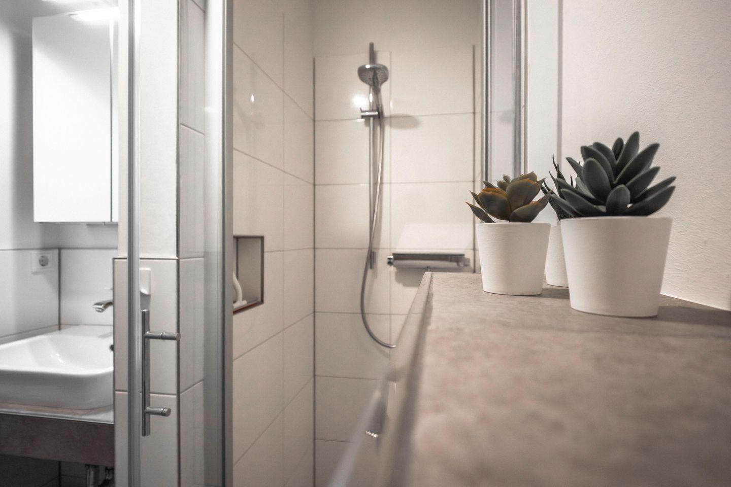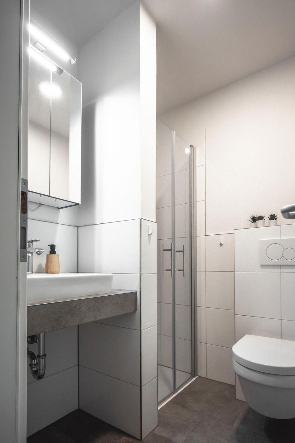 Das Badezimmer ist platzoptimiert und überzeugt mit einer bodengleichen Dusche, einem Waschbecken, WC und einem Spiegel. Für Ihre Sicherheit sind Rauchmelder und ein Feuerlöscher vorhanden. Ein Ganzkörperspiegel sorgt für zusätzlichen Komfort im Alltag.