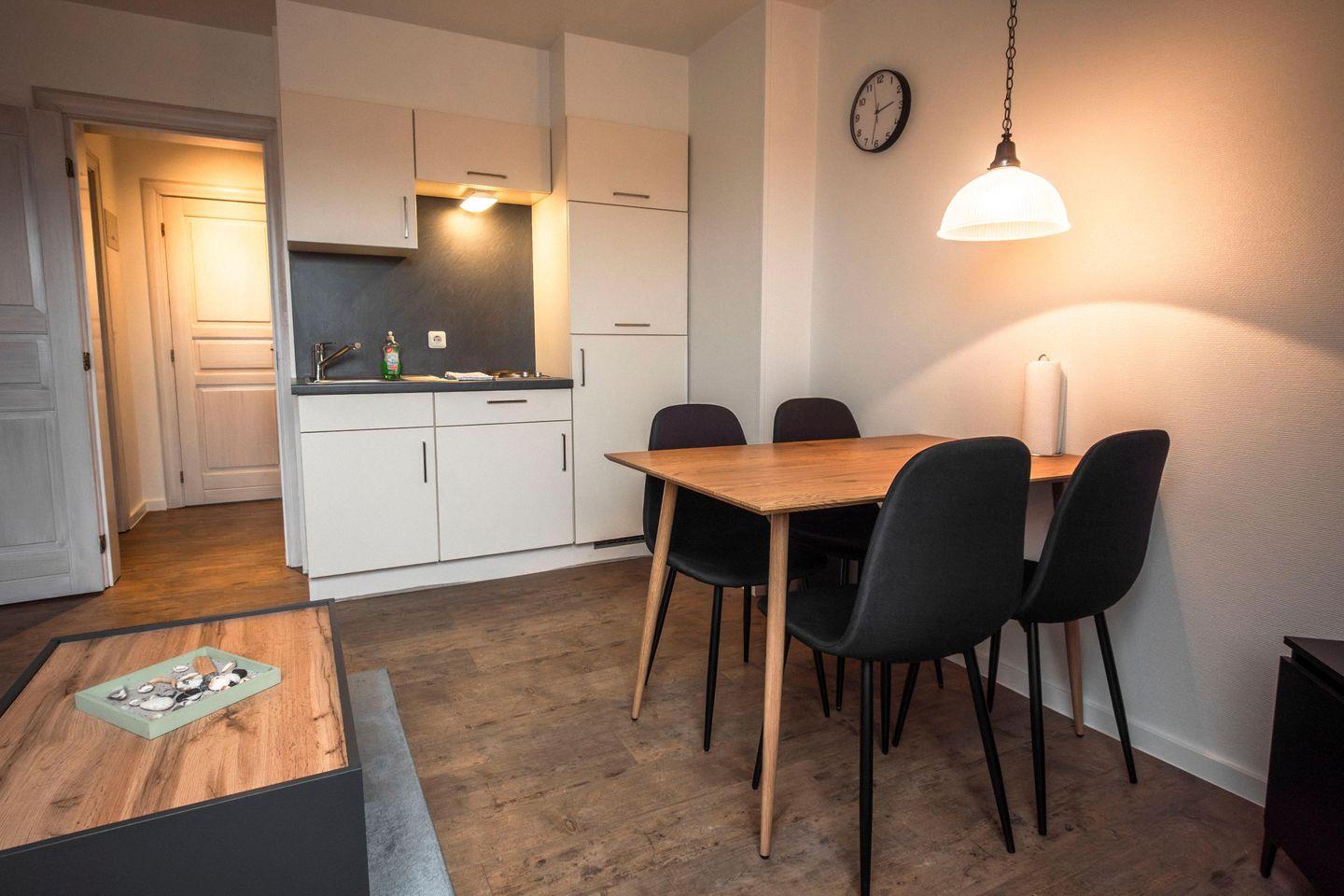 Das modern eingerichtete Apartment verfügt über insgesamt zwei Zimmer, darunter ein separates Schlafzimmer mit komfortablen Schlafmöglichkeiten für zwei Personen. Im angenehm gestalteten Wohnbereich erwarten Sie eine bequeme (Schlaf-)Sofaecke und ein Essbereich mit Esstisch und Garderobe. Die offene Küche, die sich nahtlos an das Wohnzimmer anschließt, ist mit zahlreichen praktischen Küchenutensilien ausgestattet. Hierzu zählen unter anderem ein 2-Platten-Herd, eine Mikrowelle, ein Wasserkocher, eine Kaffeemaschine, ein Toaster sowie ein Kühlschrank mit Gefrierfach. Geschirr und Besteck sind ebenso vorhanden wie Erstausstattung an Verbrauchsmaterialien, sodass es Ihnen an nichts fehlt, um Mahlzeiten bequem selbst zuzubereiten.