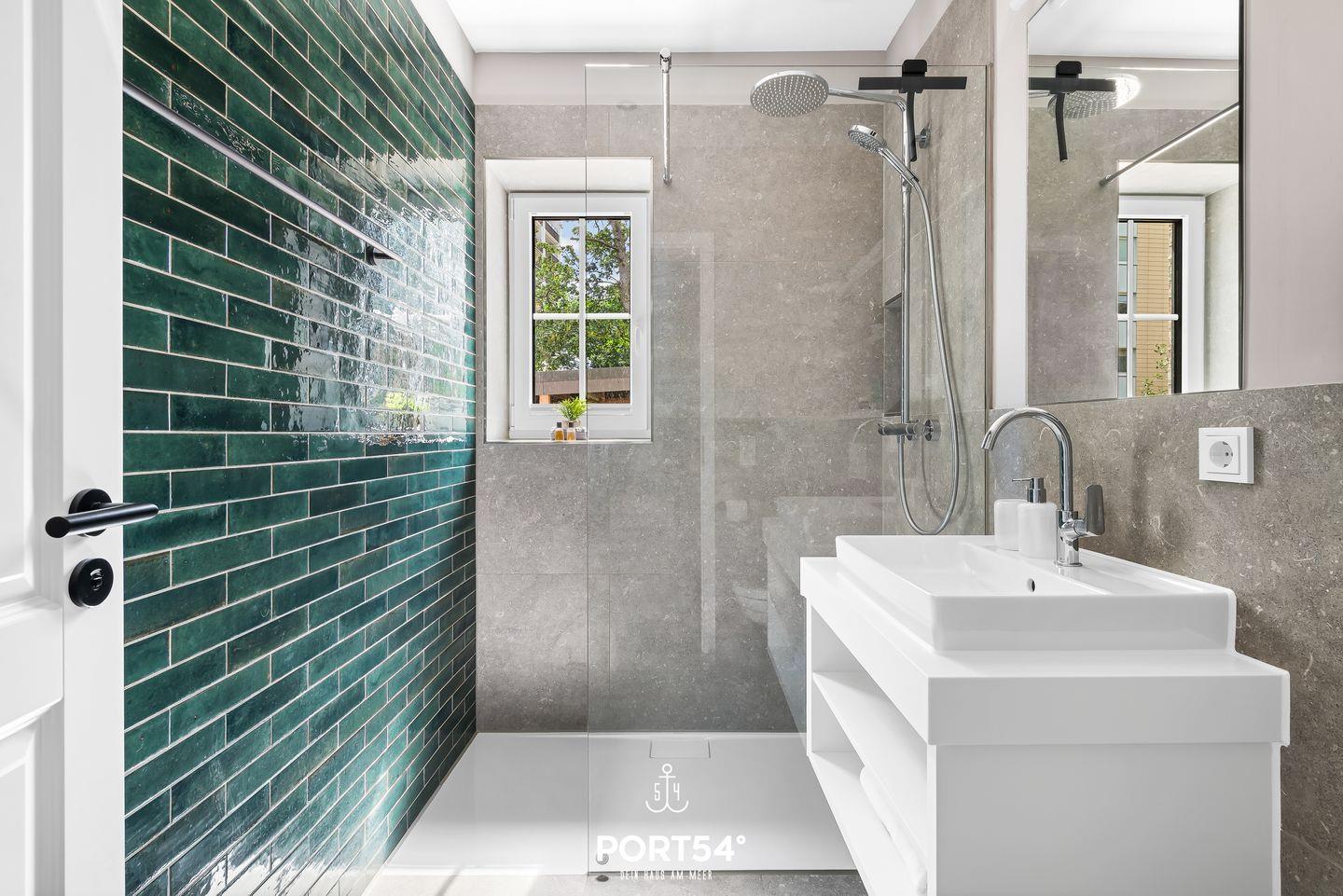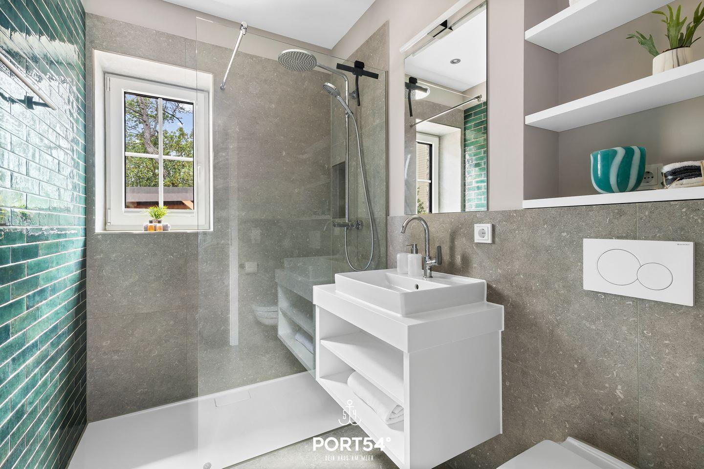 Das moderne Badezimmer ist mit einer bodengleichen Dusche, WC, Waschbecken, Spiegel, Kosmetikspiegel und Haartrockner ausgestattet. Ein Ganzkörperspiegel ist ebenfalls vorhanden. Fußbodenheizung sorgt in der gesamten Wohnung für ein angenehmes Raumklima.