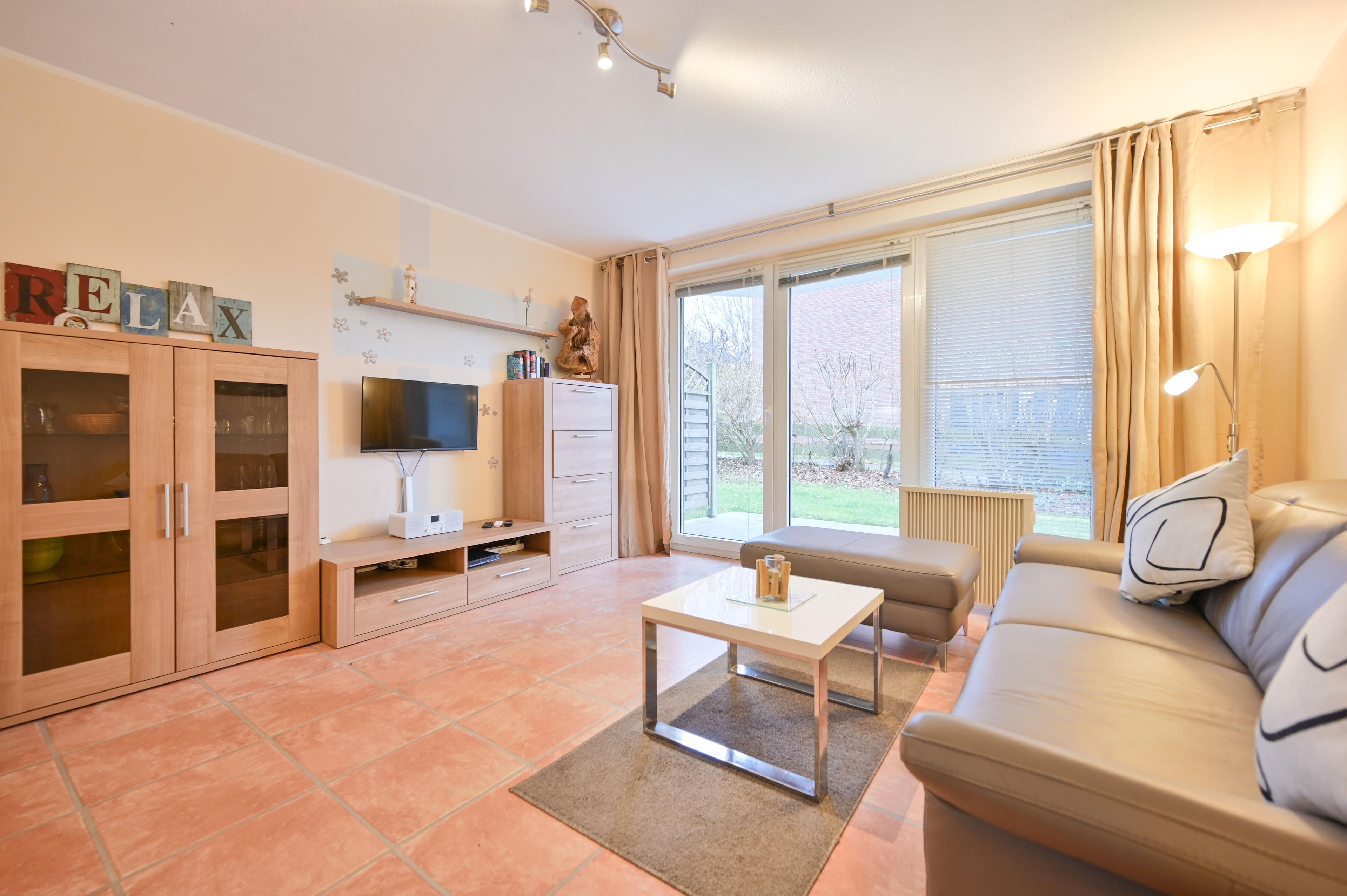Die helle, geflieste Wohnung verfügt über ein Wohnzimmer mit gemütlichem Essbereich, großem Sofa mit Recamiereteil und Flachbild-TV – ideal zum Wohlfühlen nach einem Strandtag.