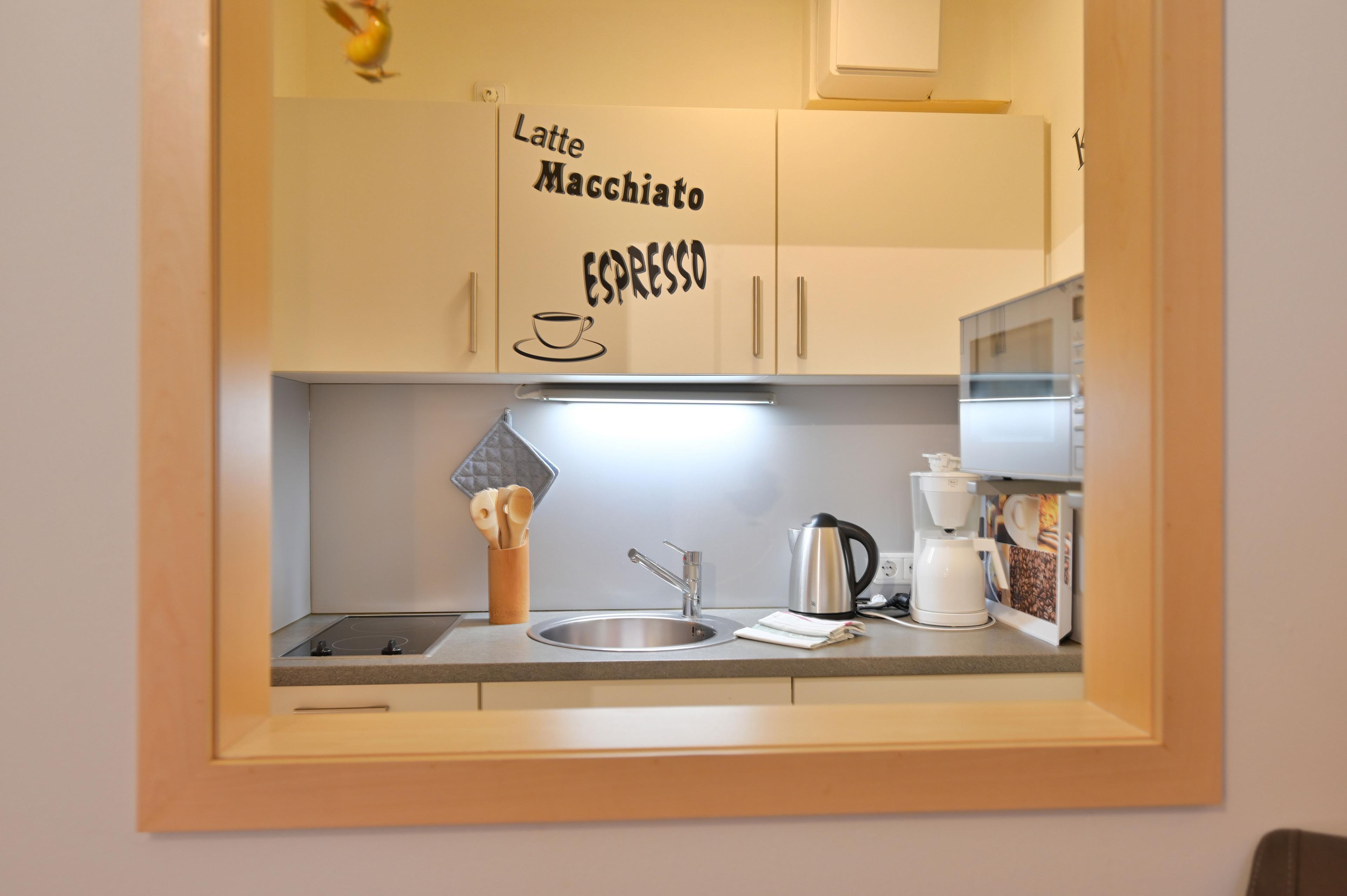 Die kleine, gut ausgestattete Küche ist durch eine praktische Durchreiche mit dem Wohn- und Essbereich verbunden und bietet alles, was Sie für die Zubereitung Ihrer Lieblingsgerichte oder Frühstück benötigen.