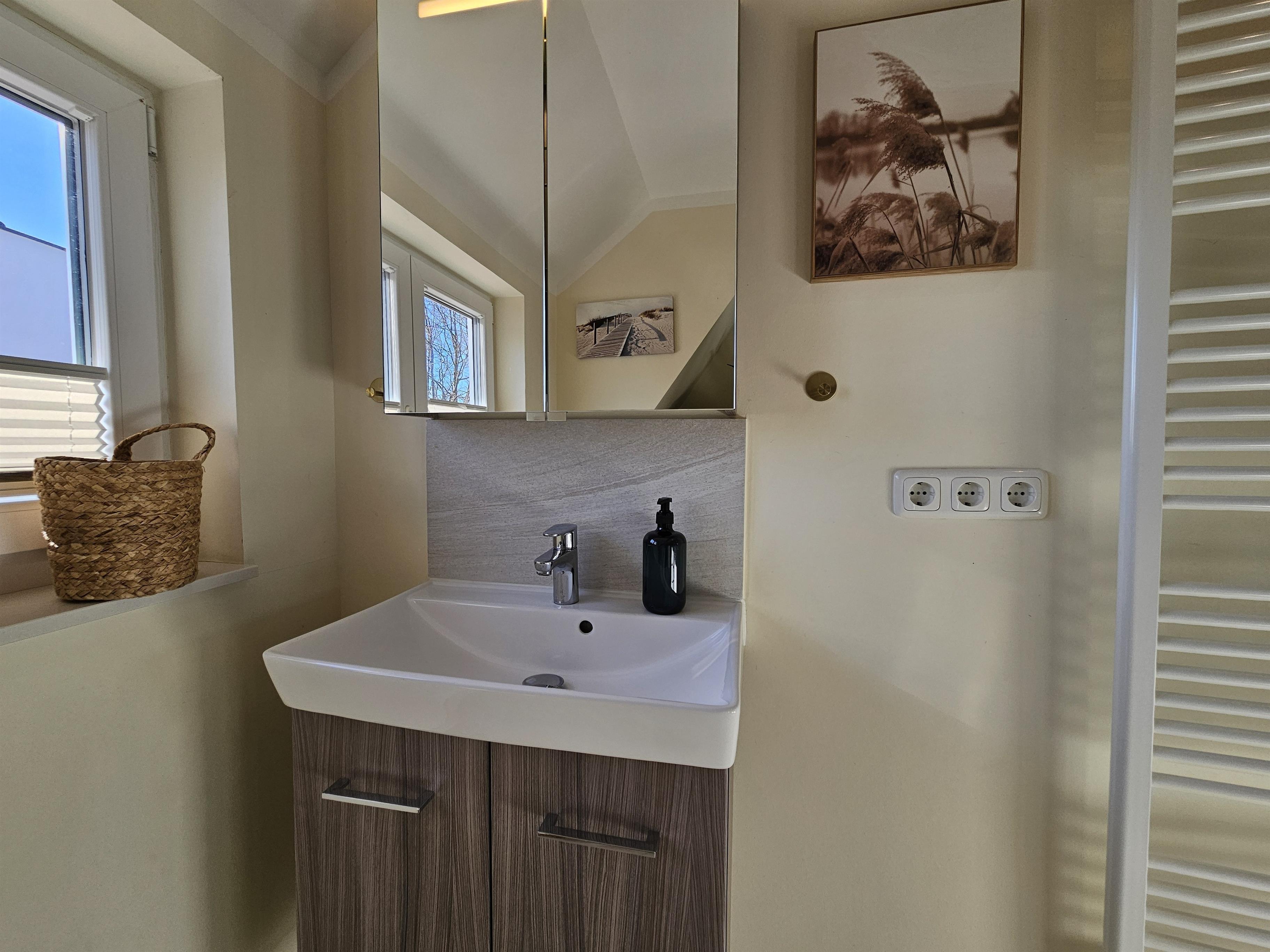 Vor dem großen Dachgeschossfenster steht ein Kicker und lädt zu einer Runde Spielspaß für jung und alt ein. Im neuen Bad befindet sich eine ebenerdige Dusche.