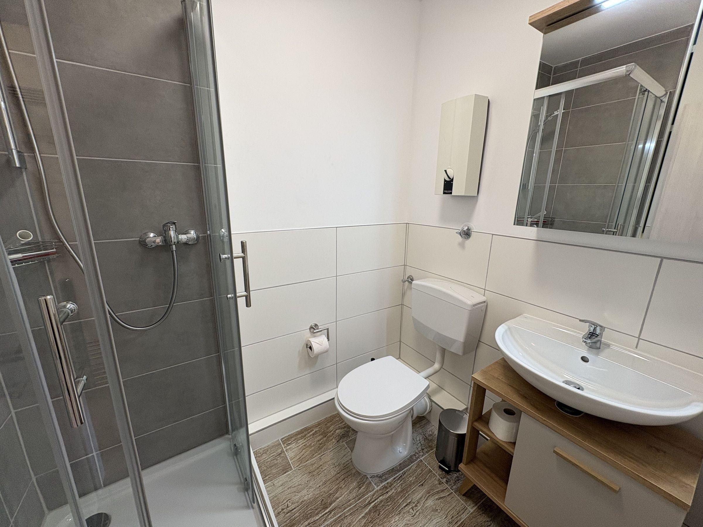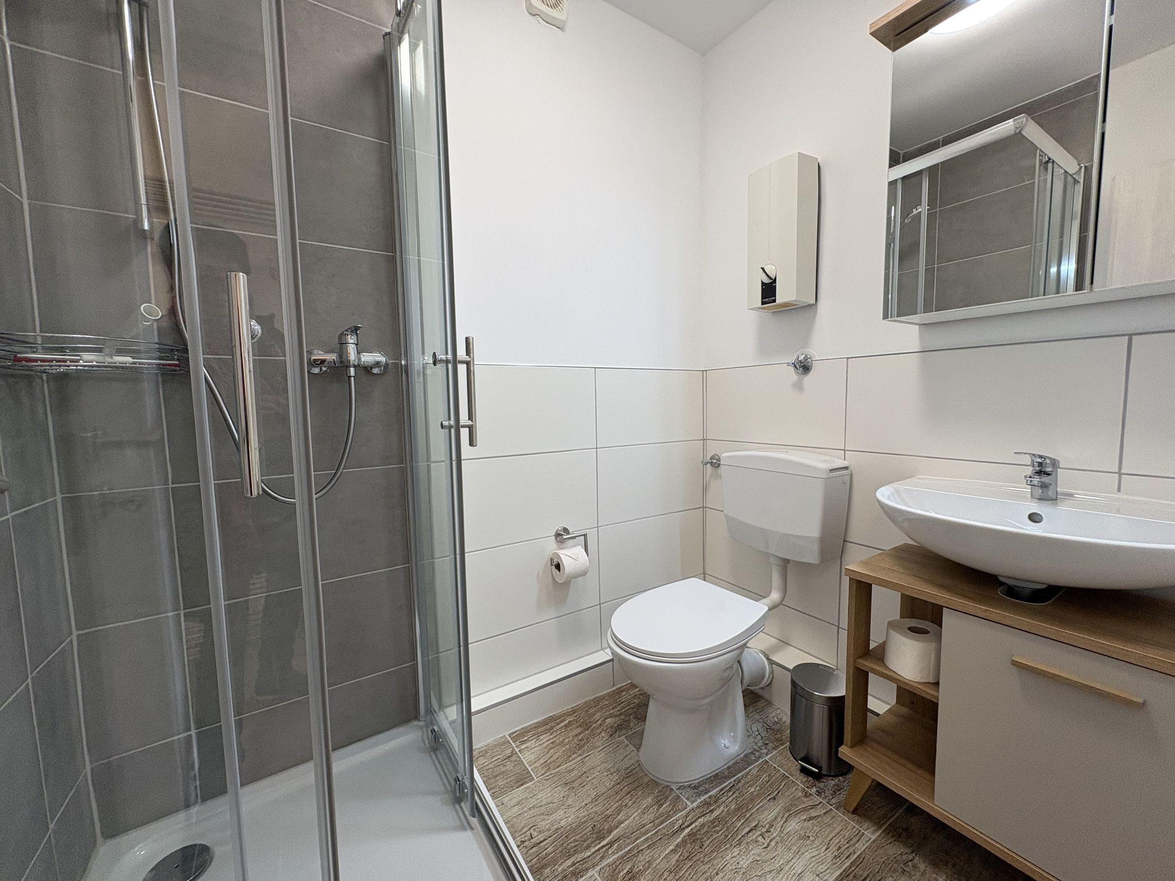 Die 2-Zimmer-Wohnung "Meeresrauschen" im Hochparterre einer Mittelreihenhausanlage bietet auf 43 m² eine einladende Unterkunft. Der Eingangsbereich verfügt über eine Garderobe. Im Wohn- und Schlafzimmer befindet sich eine Chaiselongue-Couch, ein Flachbildfernseher sowie eine gemütliche Eckbank mit großem Tisch und einem Ausgang zur Terrasse. Die voll ausgestattete Küche beinhaltet einen Backofen und einen Kühlschrank mit Gefrierfach. Das Schlafzimmer ist mit einem Einzelbett, einem Kleiderschrank und einem TV ausgestattet. Das Badezimmer bietet eine Dusche und ein WC. Im Keller steht ein Waschraum mit einer Waschmaschine zur gemeinschaftlichen Nutzung (gegen Gebühr). Fahrräder können in einem offenen und überdachten Abstellplatz gesichert werden. Ein PKW-Stellplatz gehört zur Unterkunft. Ein Hund ist gegen Gebühr willkommen.
