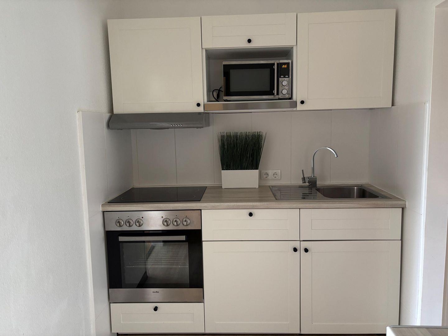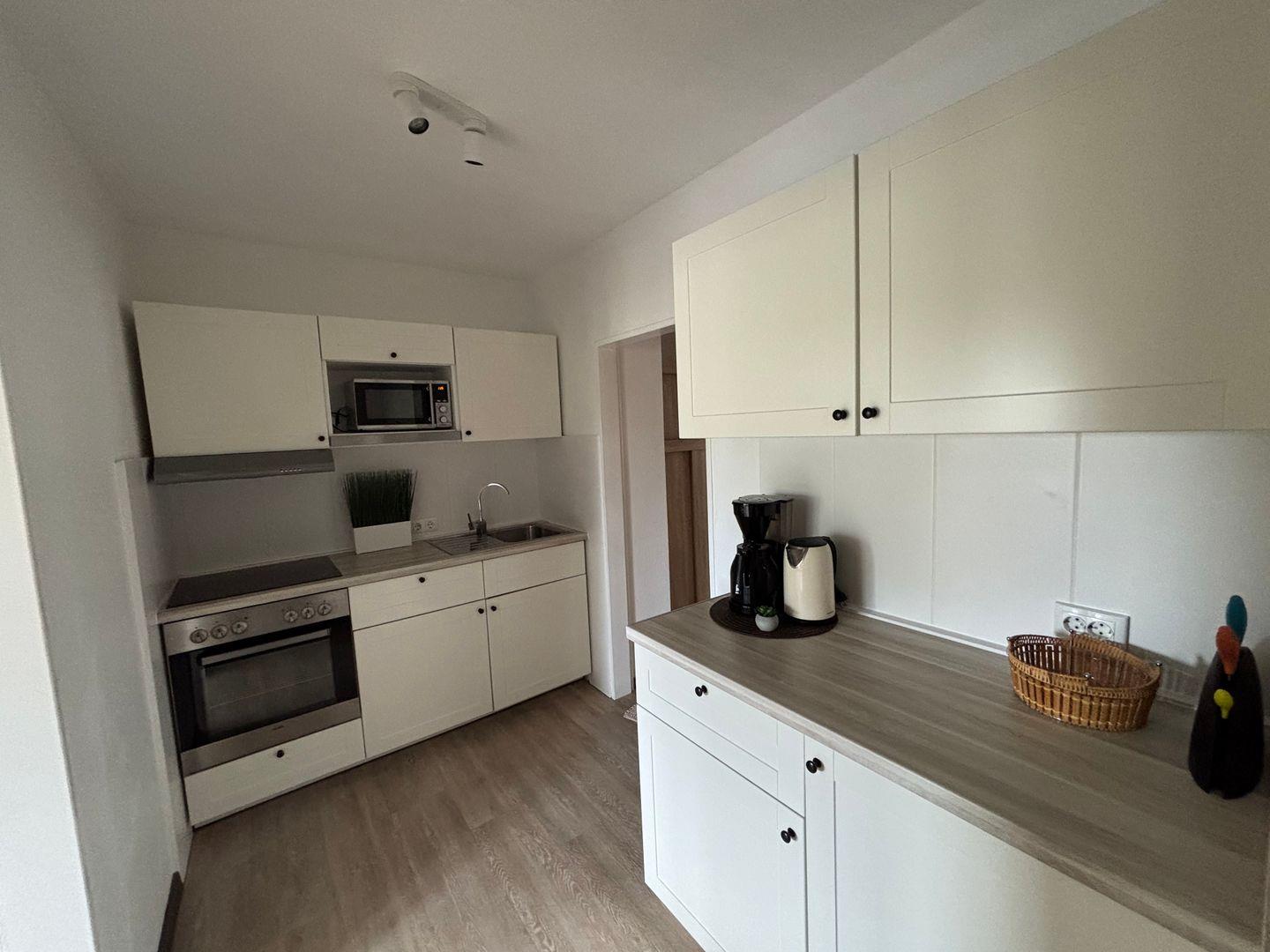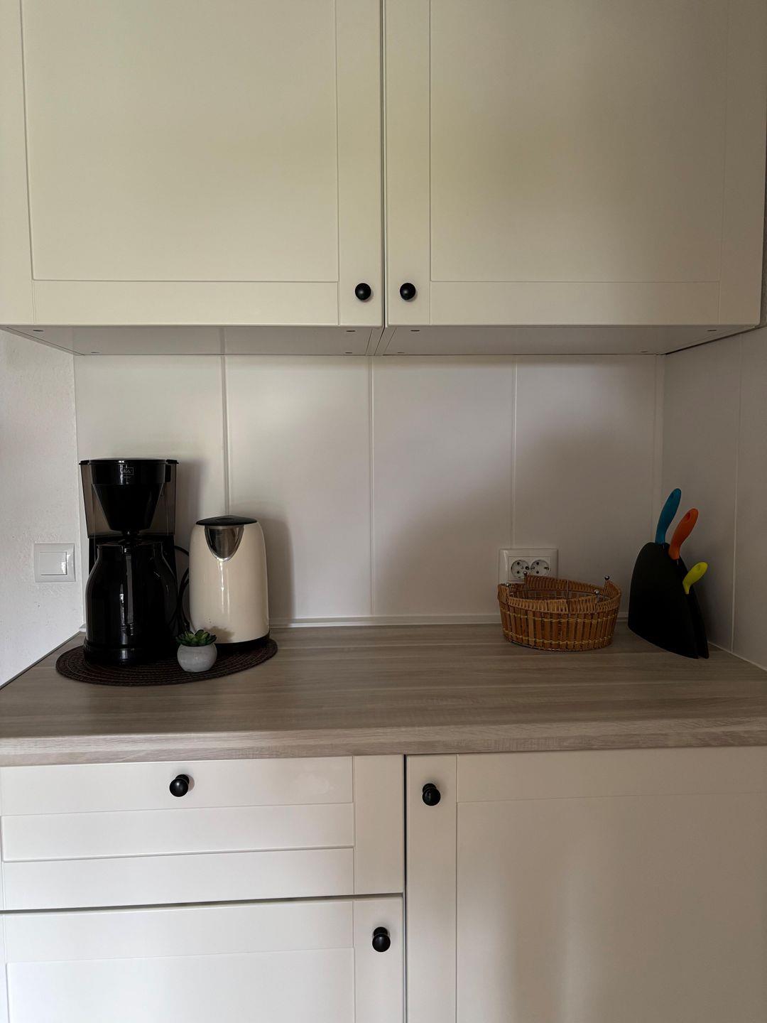 Ceranfeld mit 4 Kochzonen. Kaffeemaschine. Toaster. Eierkocher. Mikrowelle. Backofen.