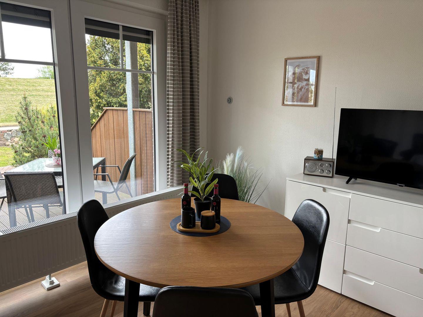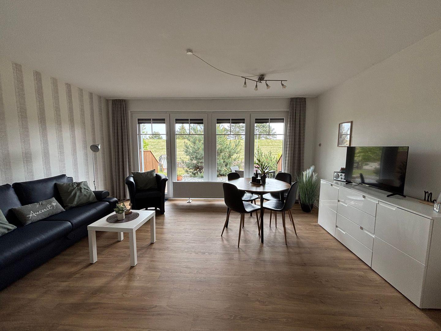 Gemütlicher Wohn- Essbereich. Bequeme Schlafcouch. Maße 2,00 m x 1,40 m. Fernseher. Radio. Entspannte Abende.
