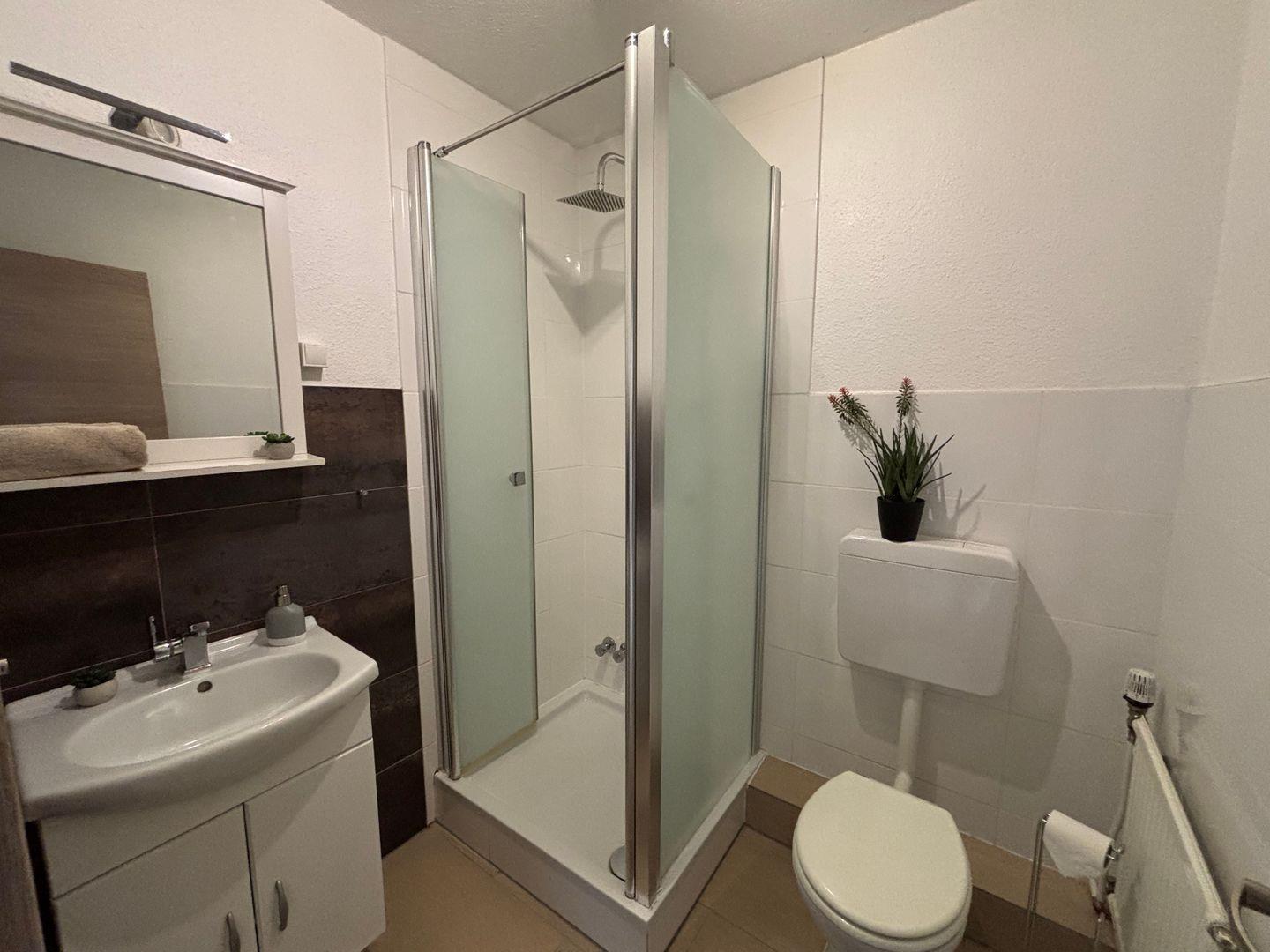 Bad mit Dusche. WC. Waschbecken.