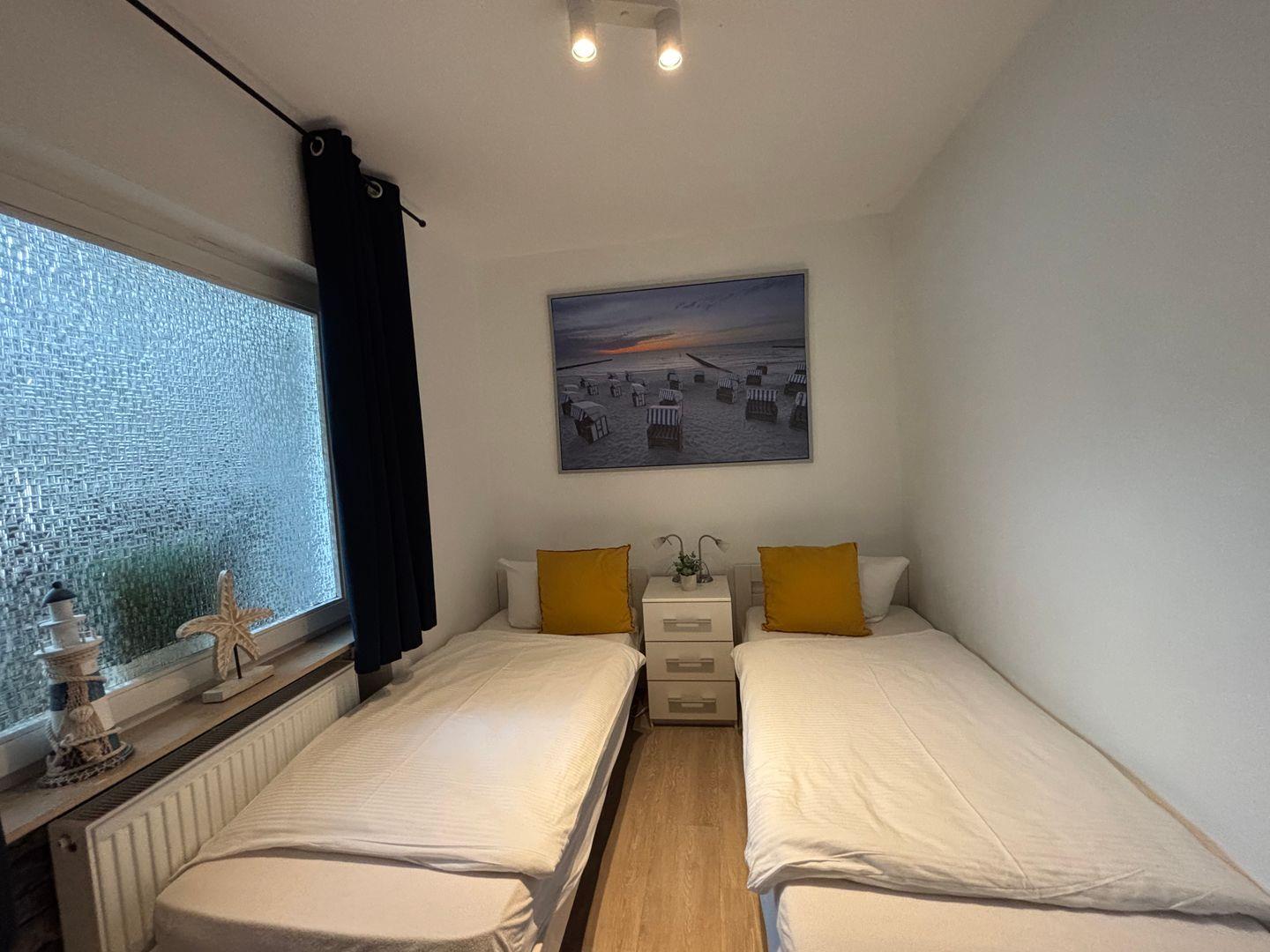 Innenliegendes separates Schlafzimmer. Zwei Einzelbetten. Maße 0,90 m x 2,00 m. Erholsamer Schlaf.