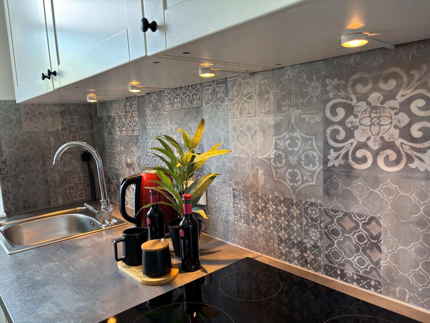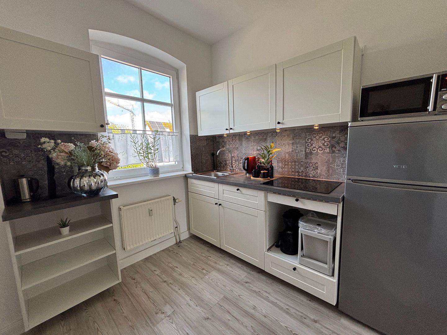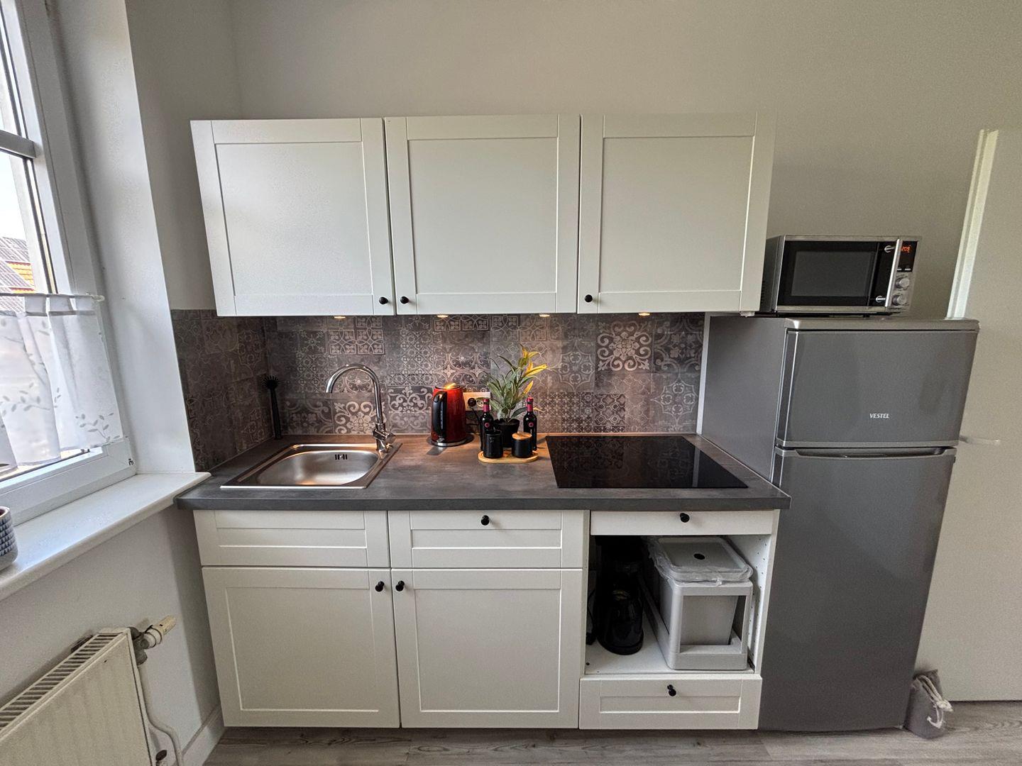 Ceranfeld mit 4 Kochzonen. Kaffeemaschine. Toaster. Eierkocher. Mikrowelle.