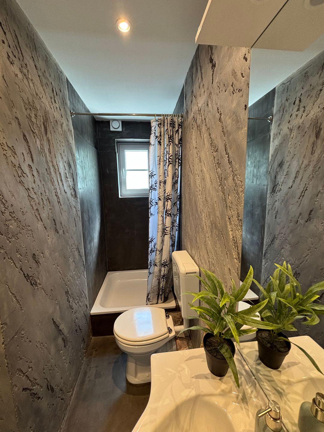 Bad mit Dusche. WC. Waschbecken.