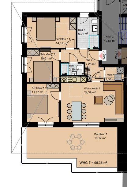 Das Penthouse verfügt über drei separate Schlafzimmer mit insgesamt sechs komfortablen Schlafplätzen. Zwei moderne, bodengleiche Duschen bieten Komfort in den beiden Bädern. Helle Räume, ein stilvoll eingerichtetes Wohn- und Esszimmer mit Sofaecke sowie eine offene, voll ausgestattete Küche schaffen ein behagliches Ambiente. Die Küche ist mit Spülmaschine, Backofen, Herd, Kaffeemaschine, Wasserkocher, Toaster, extra Gefrierschrank, Kühlschrank sowie sämtlichem Geschirr und Besteck ausgerüstet. Ein großzügiger Esstisch lädt zu gemeinsamen Mahlzeiten ein. Fußbodenheizung und die Nutzung erneuerbarer Energie über eine Wärmepumpe sorgen dabei zu jeder Jahreszeit für angenehme Temperaturen.
