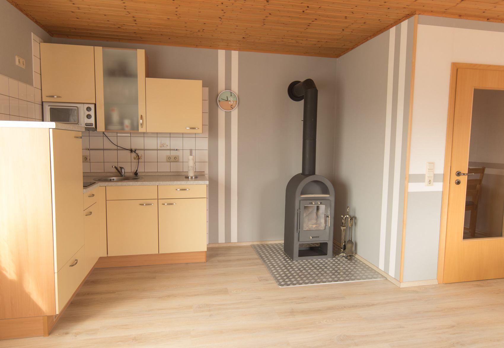 The flat has a bedroom that can be darkened and a bathroom with shower. A fireplace provides a cosy atmosphere, while modern amenities such as an induction cooker, a filter coffee machine and a kettle are available. The energy supply is environmentally friendly using solar energy.