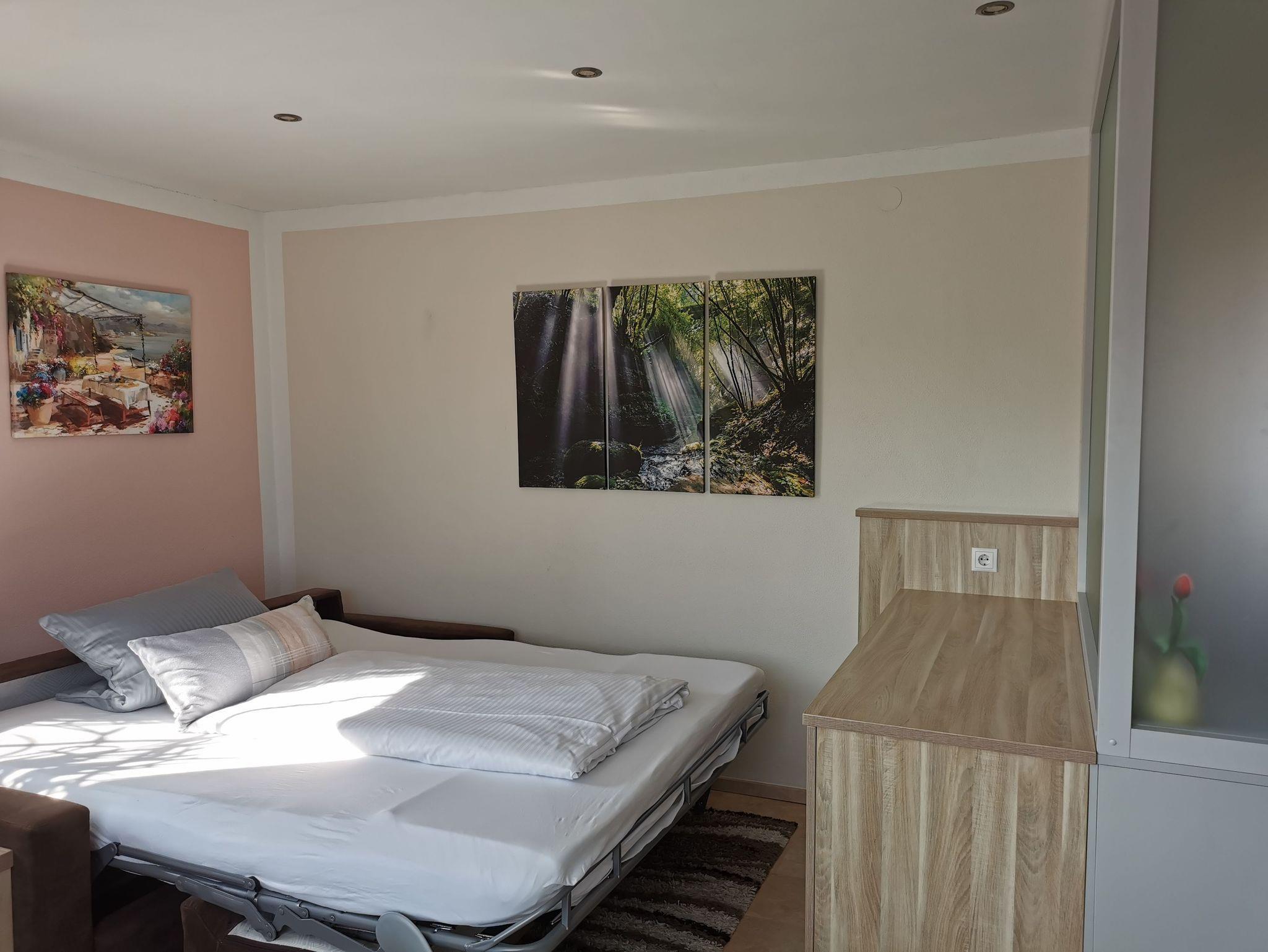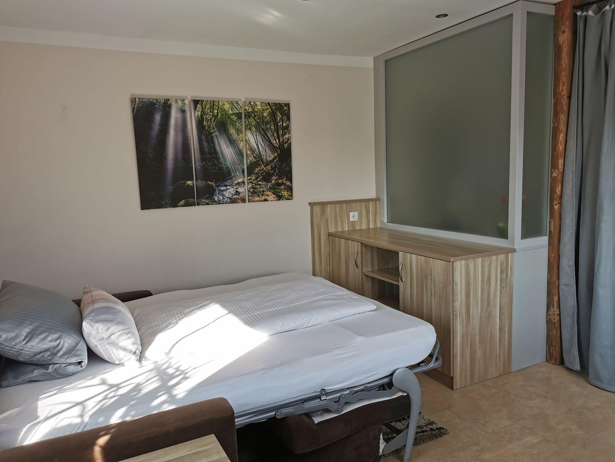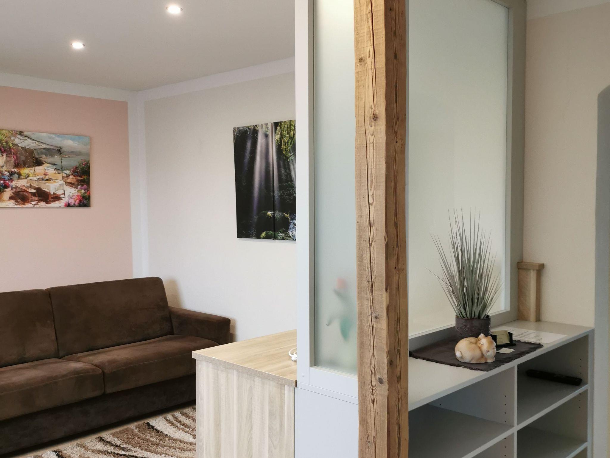 Schlafcouch im Wohnzimmer (Liegefläche 1,60m x 2,00m). Im Wohnzimmer ist ein Raumteiler mit blickdichtem Glas und Gardinen angebracht worden. Dies ermöglicht es, das Wohnzimmer auch als separates Schlafzimmer zu nutzen.