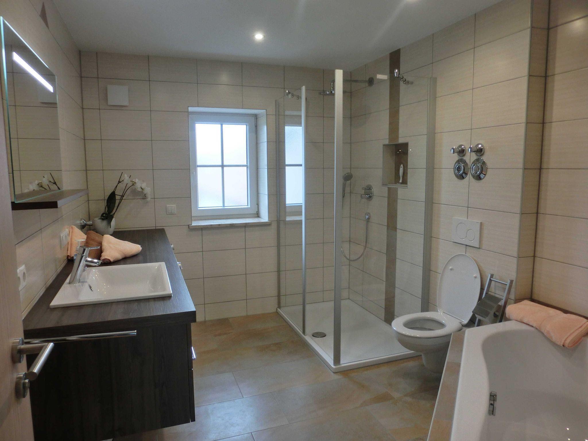 Im Bad befinden sich: Wellness-Dusche (Regentropfendusche), Eckbadewanne, Waschmaschine und Wäschetrockner.