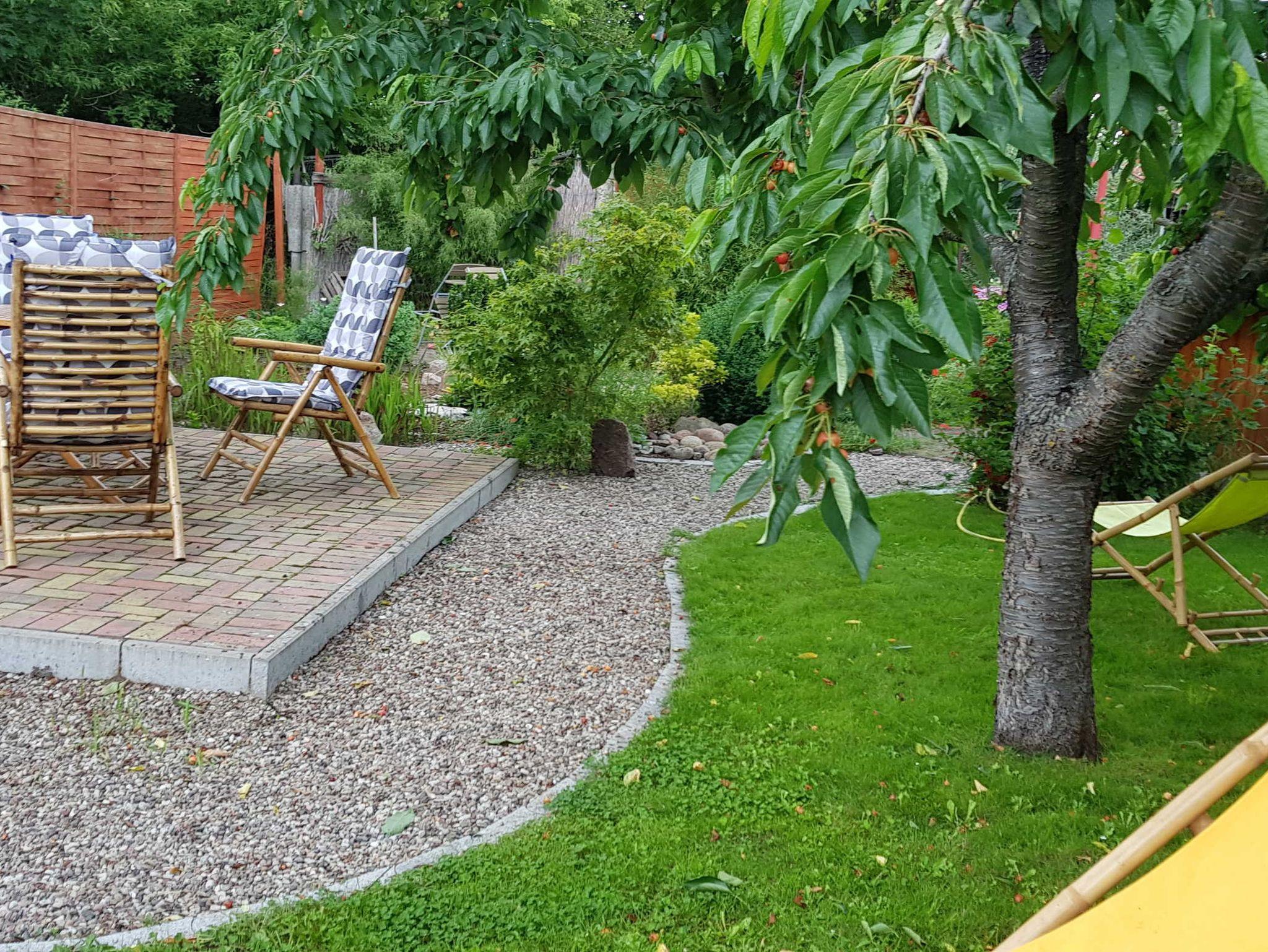 Ferienwohnung im Garten mit Liegewiesen, 1 Wohn-/Schlafraum mit Eckcouch und TV. 1 Schlafraum mit Doppelbett und großem Schrank, Dusche mit WC, Küche mit Essplatz, Kühlschrank, Mikrowelle, Wasserkocher, Geschirrspüler, Toaster, Kaffeemaschine und für's Sonntagsei ein Eierkocher; Parkplatz, WLAN, Grillplatz