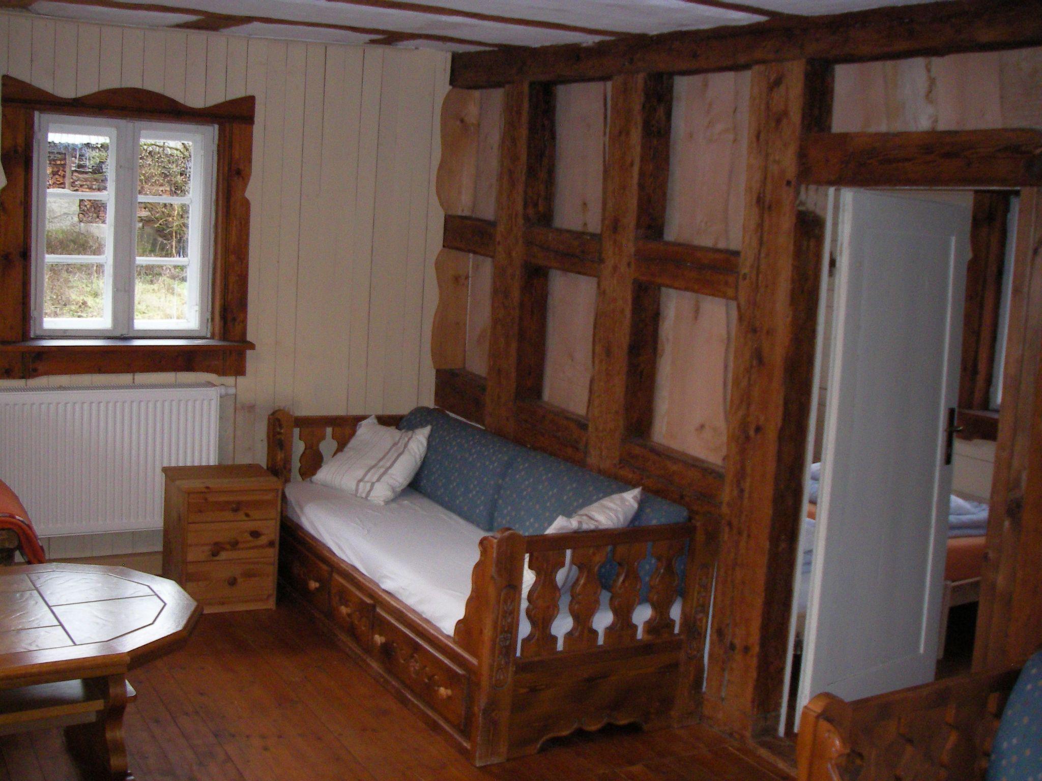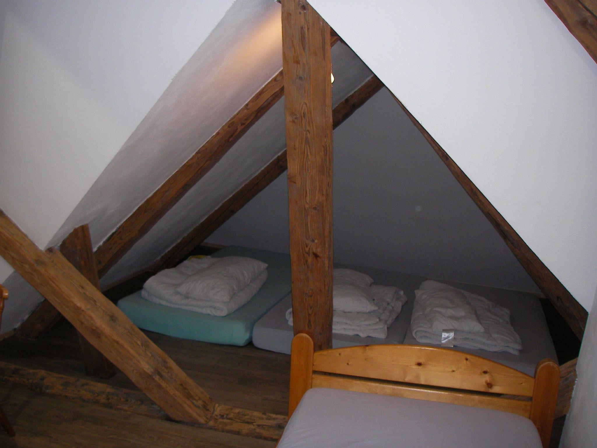 The interior of the lovingly renovated castle, which was built in 1650, combines modern comfort with historical flair. Furniture from bygone times, original windows and doors as well as exposed, restored ceilings add to the charm. A spacious kitchen with dining area, dishwasher and two fridge freezers, a cosy living room with two sofas, table, chairs, wardrobe, Wi-Fi and TV as well as numerous sleeping options, including rooms with four-poster beds, single and double beds and a large dormitory in the attic, await guests.