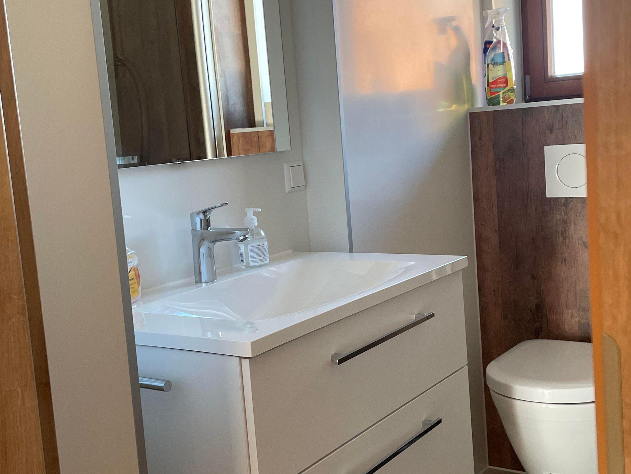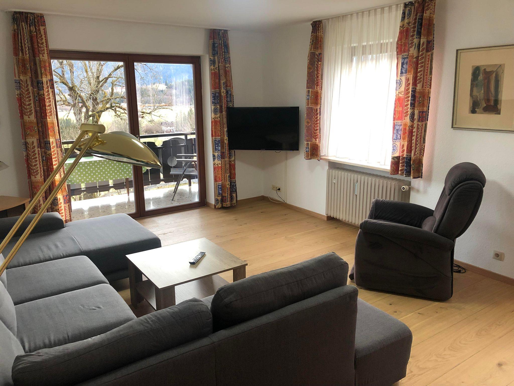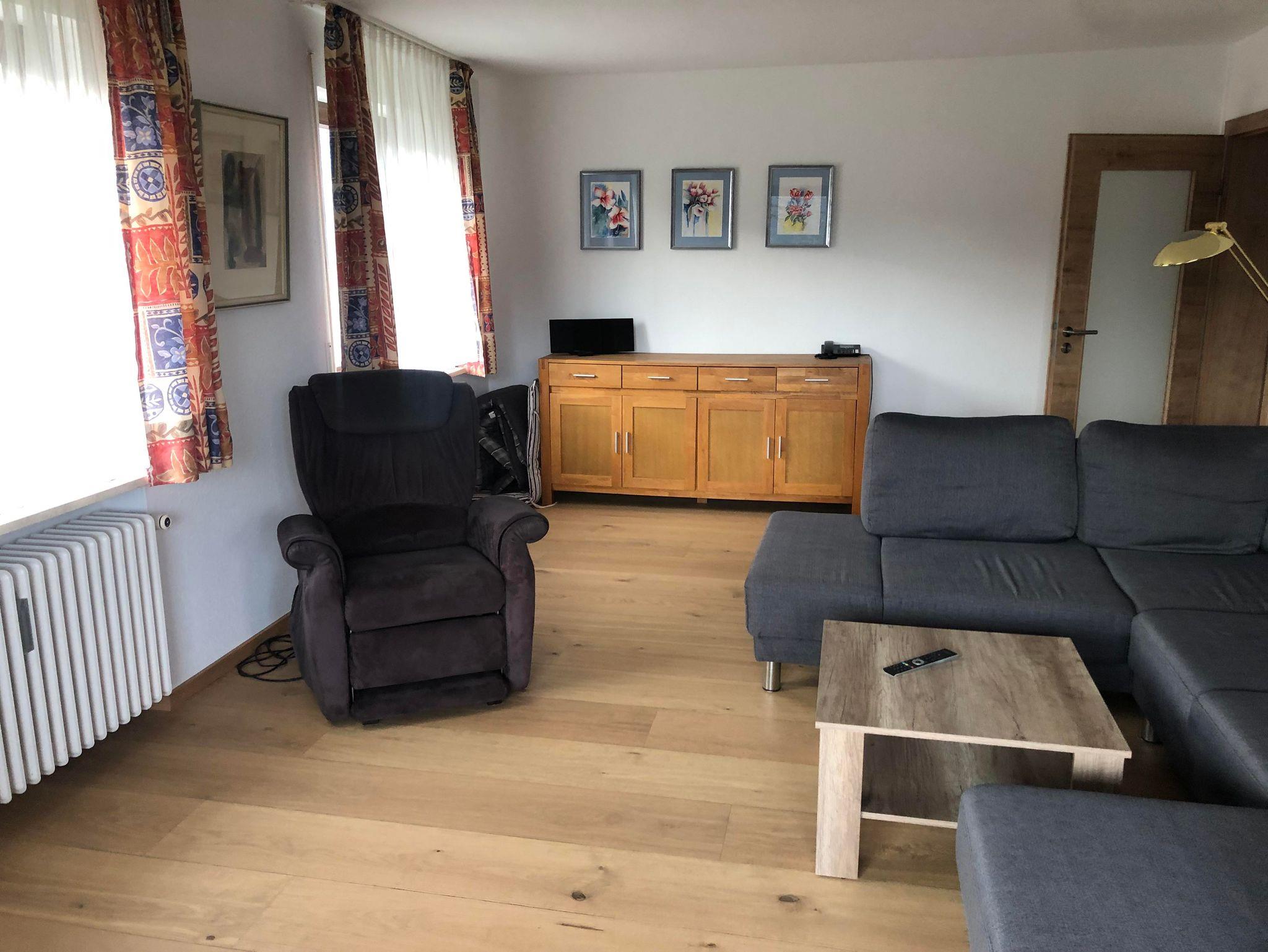 Gut möblierte Wohnung mit Küche, Wohnzimmer mit Polstergarnitur und Fersehsessel, TV, Radio, 1 Doppelschlafzimmer, Dusche mit WC, großer Südbalkon, Toaster, Heißwasserkocher, Mikrowelle, Radiowecker.
