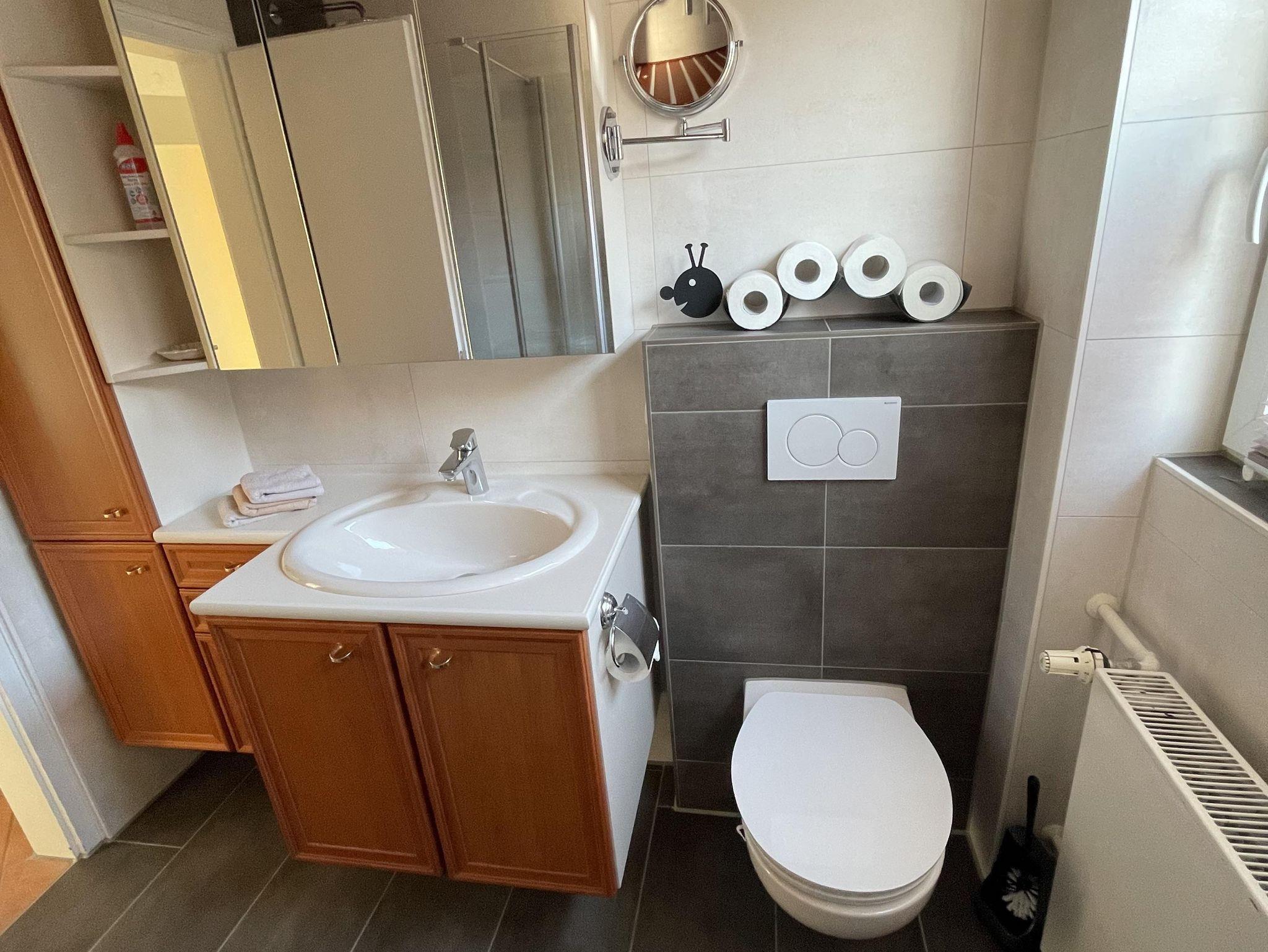 • 2 Schlafzimmer mit Doppelbett (1,60 m x 2,00 m und 1,80 x 2,00 m) mit viel Stauraum in geschreinerten Einbauschrank,1 Bad mit WC und Dusche, Schminkspiegel Spiegel mit Beleuchtung, Fön, Stauraum