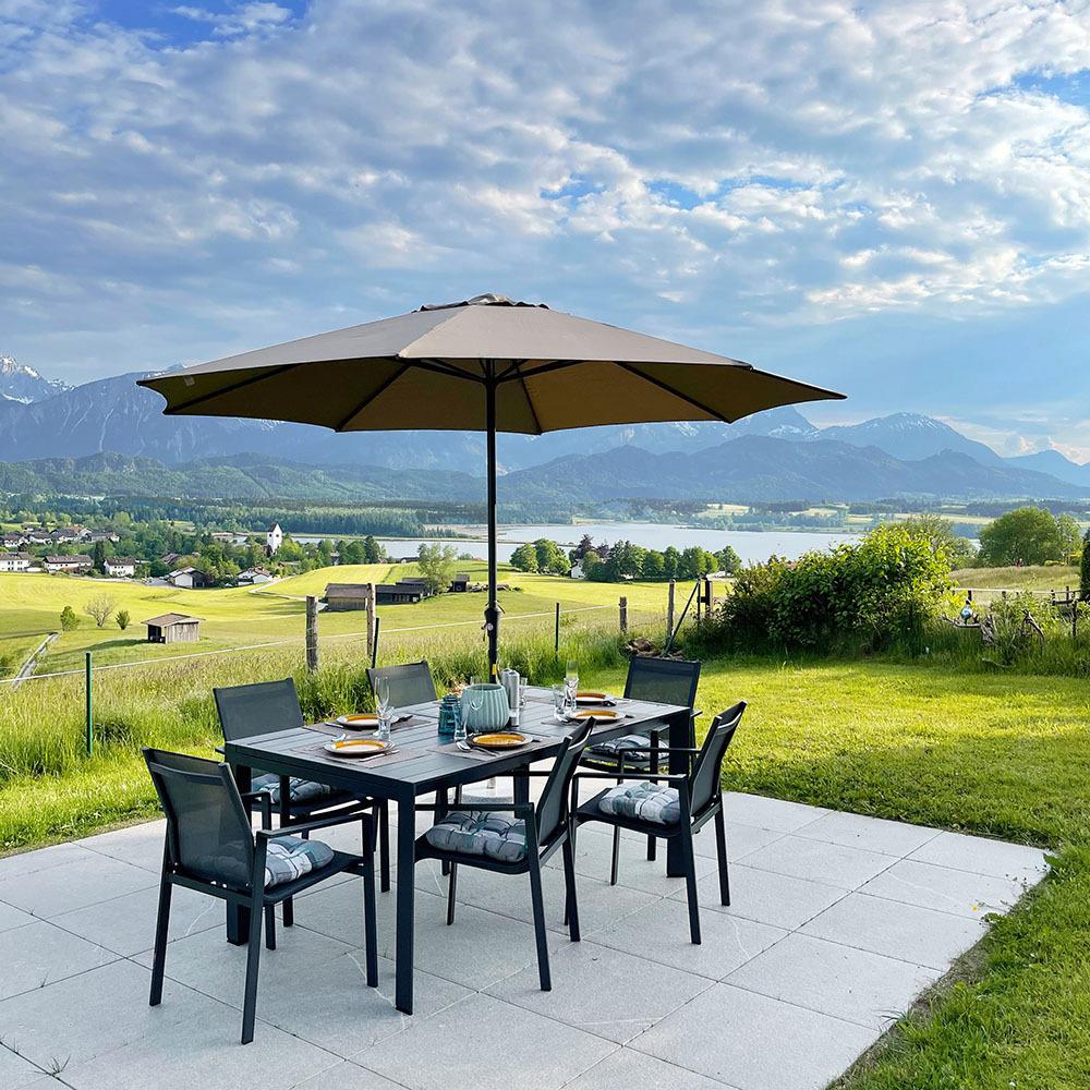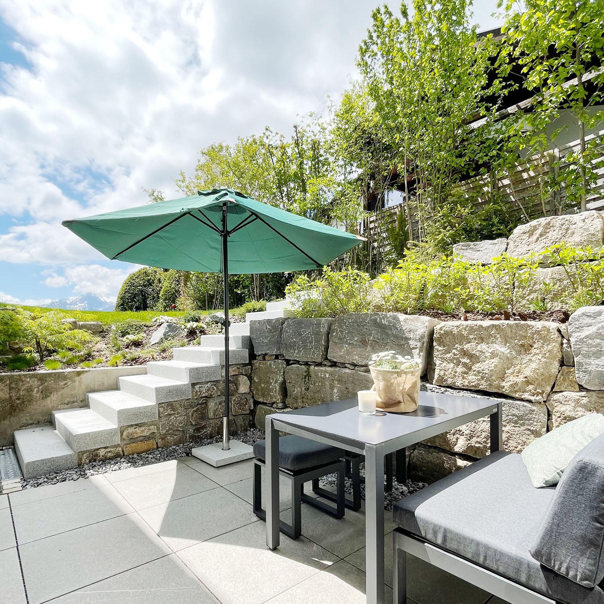 Angrenzend an den Eingangsbereich der Wohnung befindet sich eine schöne und großzügige Terrasse, die mit Esstisch, Liegebank und Lounge ausgestattet ist und somit entspannte Abende mit Bergblick verspricht.
