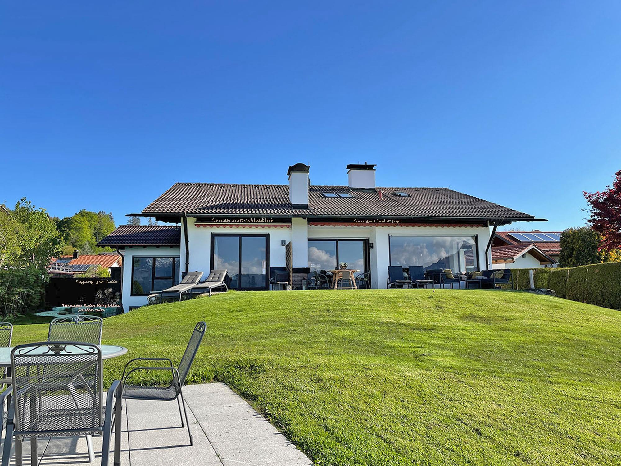 Ein für diese Wohnung vorgesehener Gartenbereich auf der Südseite mit großem Esstisch, Grill und Sonnenschirm bietet einen herrlichen Ausblick auf den See, die Alpen und Schlösser.