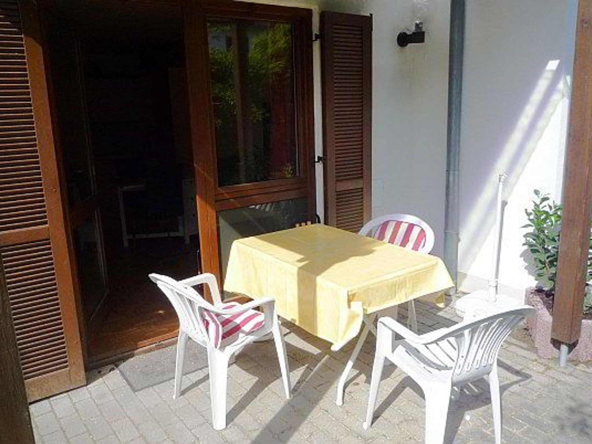 Ein Schlafzimmer mit Doppelbett, Etagenbett in Koje, Kaminofen, separater Essplatz, voll ausgestatteter Küchenbereich mit Spülmaschine, Kühlschrank mit Gefrierfach, Mikrowelle. Relaxsessel und ausklappbares Bettsofa im Wohnzimmer. Diele mit Garderobe, Dusche/WC, Terrasse, LCD-TV mit Empfang sky und Telefon, Internet. Kinderhochstuhl, Kindergeschirr, Kinderterrassenmöbel, Liege.
