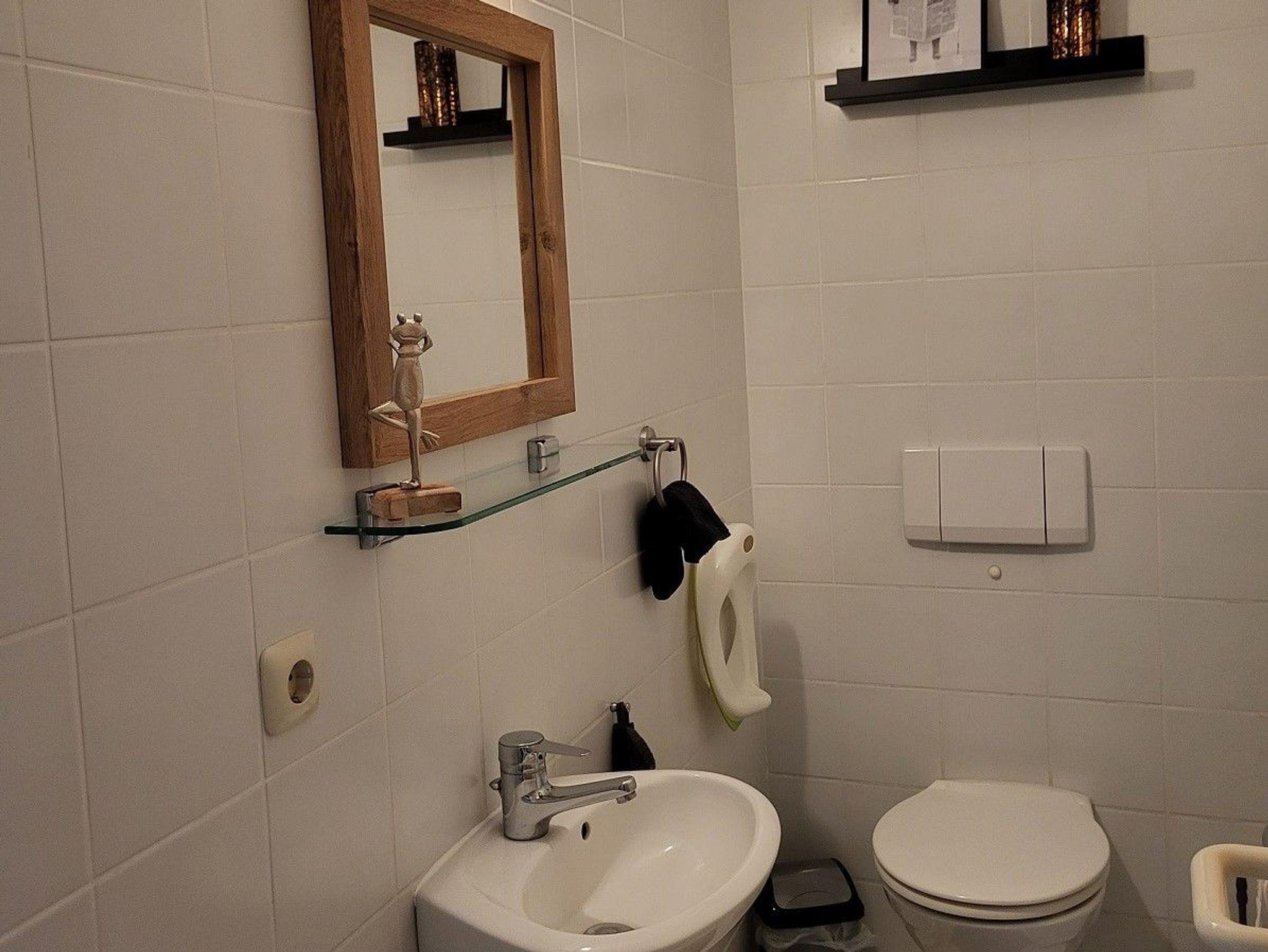Zwischen den Schlafräumen befindet sich das Badezimmer mit Doppelwaschbecken, Dusche und WC. Ein Föhn steht hier für Sie bereit. Das danebenliegende Gäste-WC rundet den Komfort für die ganze Familie ab.