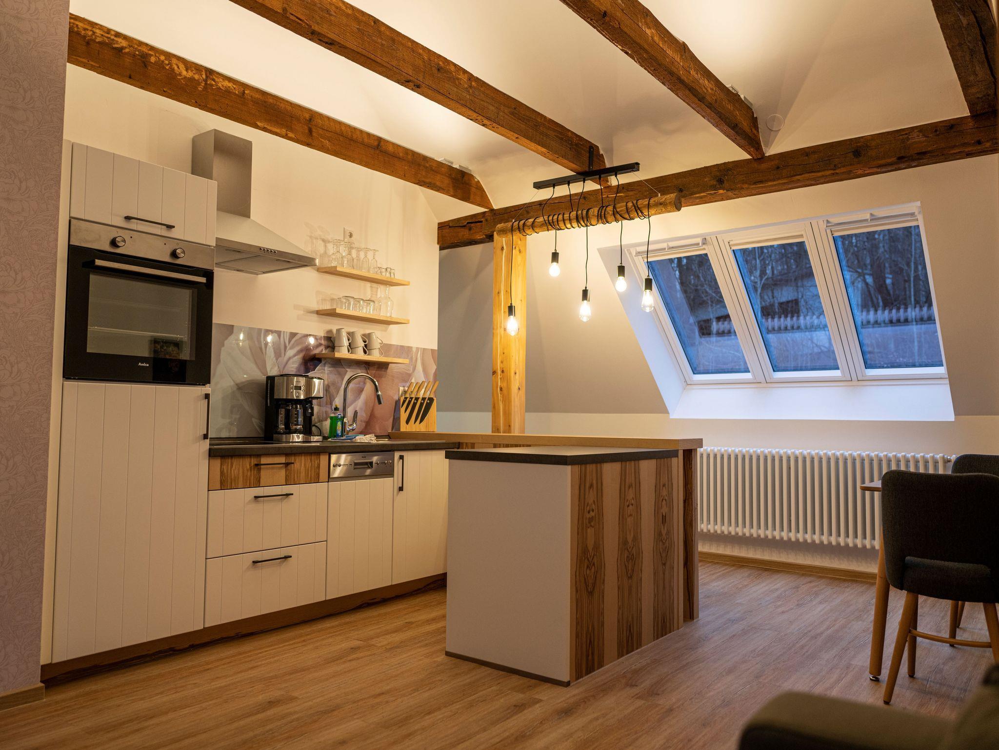 Großzügige, hell und freundlich gestaltete Dachgeschosswohnung für 2 bis 4 Personen. Die Wohnung verfügt über einen großzügigen Wohnraum mit bequemem Sofa und offener, gut ausgestattete Küche, ein Schlafzimmer mit Doppelbett und ein Bad.