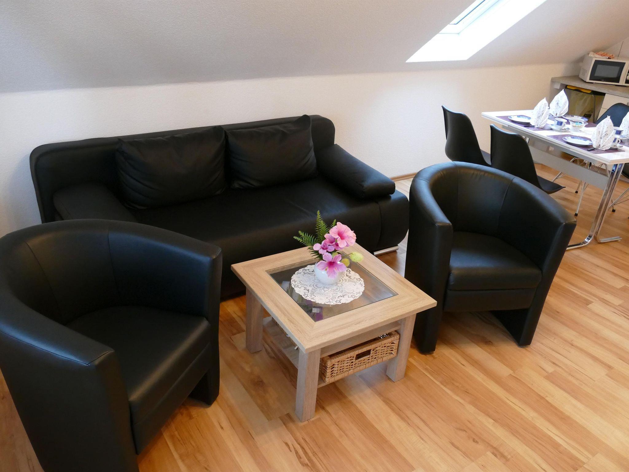 Die 50 m² große Ferienwohnung für zwei bis vier Personen (zwei Erwachsene und zwei Kinder) verfügt über eine gute Ausstattung. Komplett eingerichtete Küche (offen zum Wohn-/Schlafzimmer) mit Geschirr, Töpfen, Pfannen, Kaffeemaschine, Toaster, Wasserkocher, 4-Platten E-Herd mit Backofen, Kühlschrank. Gemütliches Wohn-/Schlafzimmer mit Sitzecke und SAT-TV. Sep. Schlafzimmer, Bad mit Dusche/WC, Balkon. Bettwäsche, Handtücher, Endreinigung und Nebenkosten inklusive.
