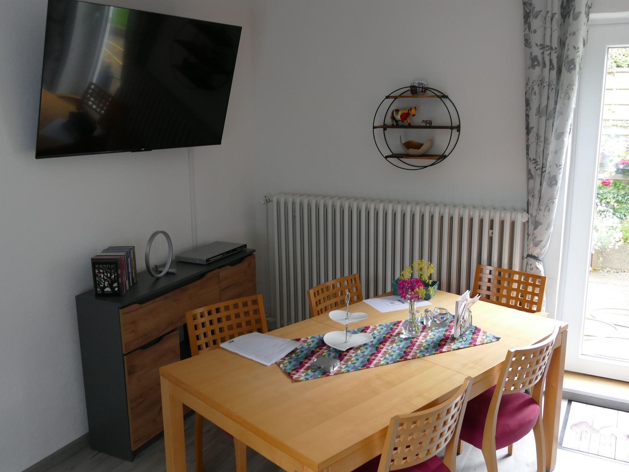 Die Wohnung verfügt über ein helles, freundliches Wohnzimmer, das mit einem gemütlichen Sofa, einem Flachbild-TV (Smart-TV, mit Netflix) und einem Essbereich ausgestattet ist – perfekt zum Entspannen nach einem erlebnisreichen Tag.