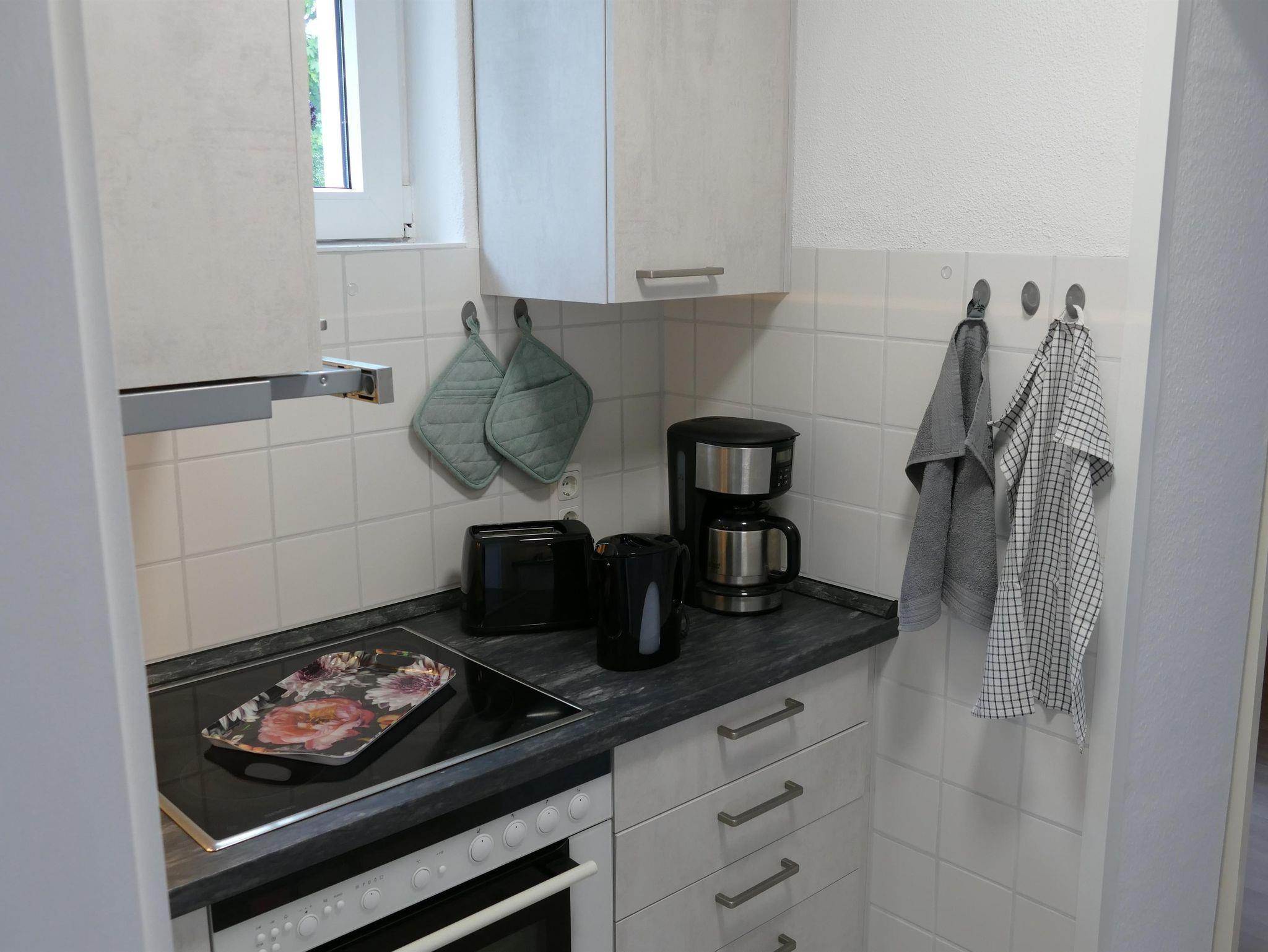 Die voll ausgestattete Küche bietet alles, was Sie zum Kochen brauchen – von Herd, Backofen, Kühlschrank und Geschirrspülmaschine bis hin zu Kaffeemaschine und Geschirr.