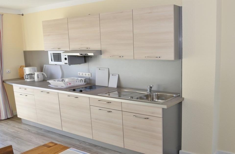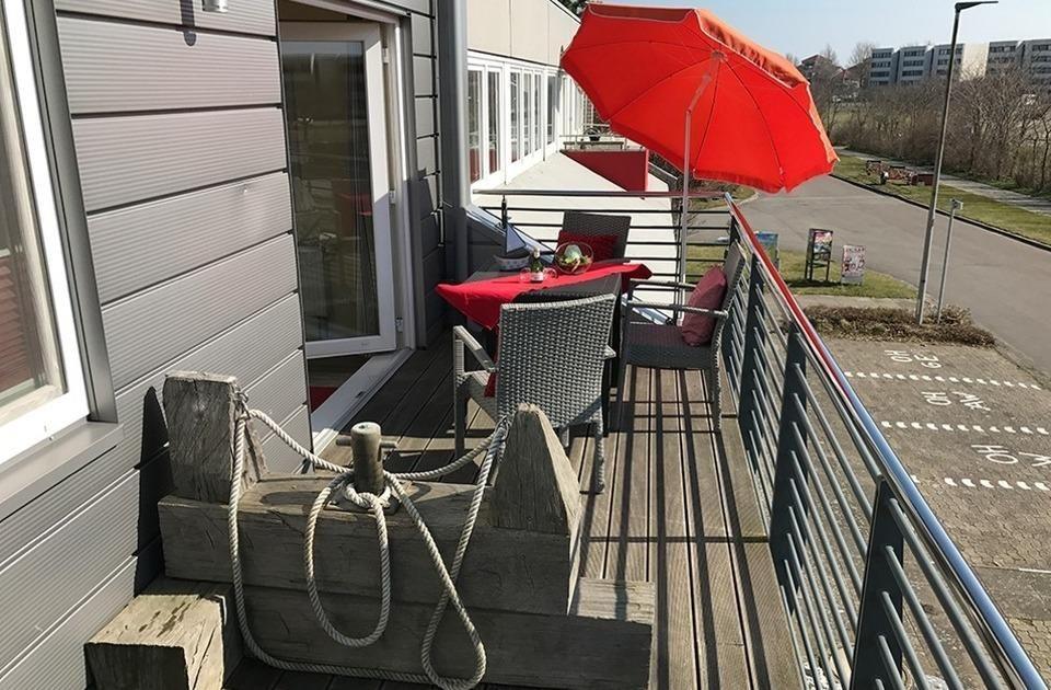 Die Wohnung 10 ist die Eckwohnung im 1. Obergeschoss und somit ideal für Gäste, die es etwas ruhiger mögen. Sie ist über die Terrasse zu erreichen. Im Objekt befindet sich ein festes w-lan Netzwerk, in der Wohnung ein smart TV. Die Wohnung besteht aus einem großen Wohn-/Schlafraum mit Schlafsofa (140x200cm) sowie einem Wandklappbett (180x200cm) und einem Essplatz für bis zu 6 Personen. Die im selben Raum befindliche Versorgungsbar ist mit einem Kühlschrank, einer Mikrowelle und einem Kochfeld sowie einem mobilen Minibackofen ausgestattet. Geschirr und alles was Sie für Ihren Urlaub benötigen ist ebenfalls vorhanden. Separat steht Ihnen noch ein Schlafzimmer mit Doppelbett (180x200cm) sowie einen Kleiderschrank zur Verfügung. Das Duschbad rundet die Wohnung mit ihren 53qm ab.