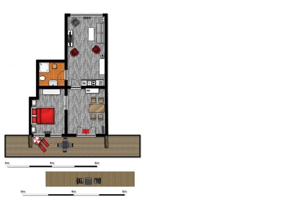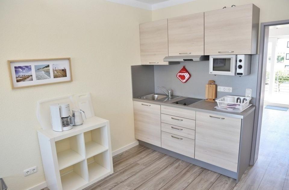 Die Wohnung besteht aus einem Wohn-/Schlafraum mit Schlafsofa (140 x 200cm), TV, BluRay-Player und einer Versorgungsbar mit Kühlschrank, Cerankochfeld und Mikrowelle. Eine Kaffeemaschine sowie ein Toaster sind ebenfalls vorhanden. Separat zum Wohnzimmer haben Sie einen Essraum mit einen Tisch und 4 Stühlen sowie einem Mini-Mobilbackofen und ein Schlafzimmer ist mit Doppelbett und Kleiderschrank.Im Objekt befindet sich ein festes w-lan Netzwerk, in der Wohnung ein smart TV. Die Wohnung ist über die Terrasse zu erreichen, welche nach Süden gelegen ist und ausreichend groß ist. Ein eigener kostenfreier PKW-Stellplatz sowie gratis W-LAN Zugang in der Wohnung ist ebenfalls vorhanden.