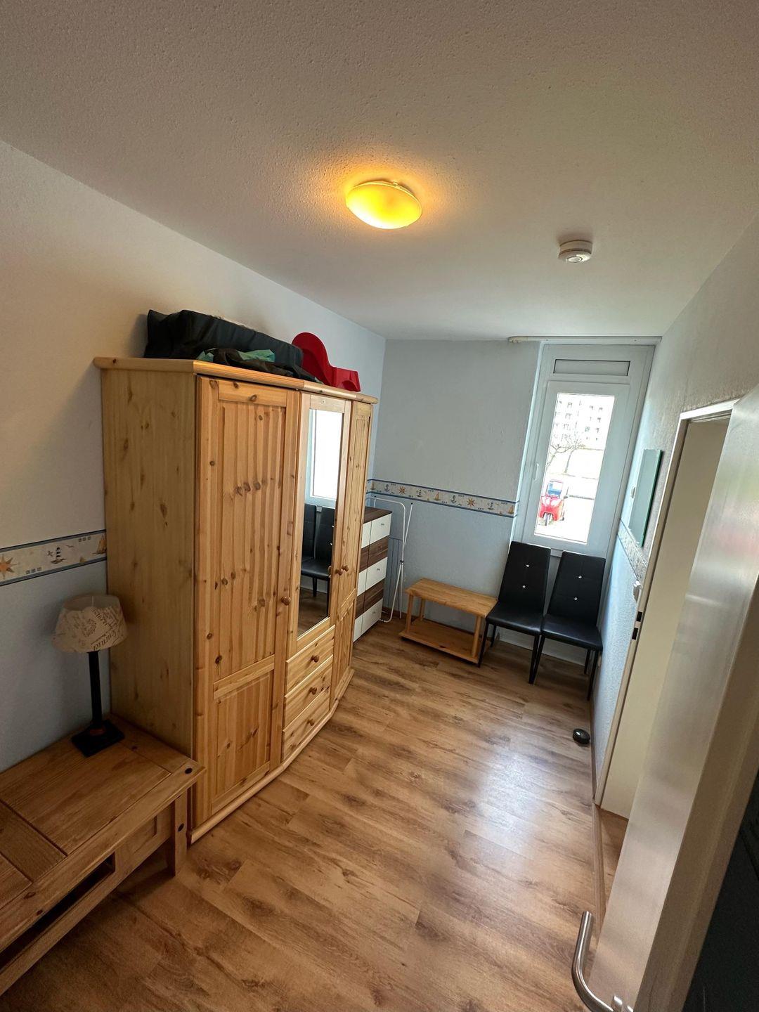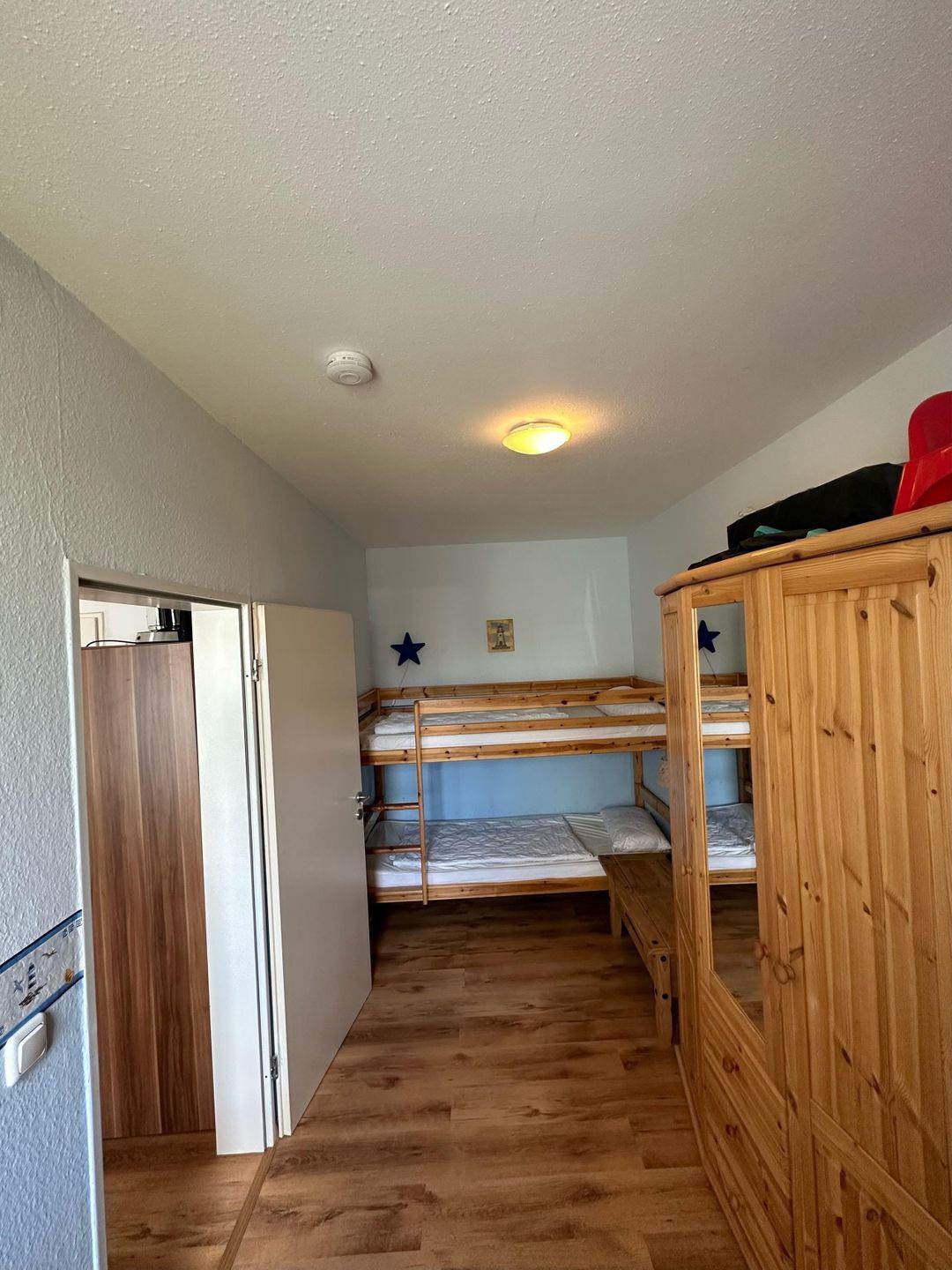 Im angrenzenden Schlafzimmer befinden sich ein Etagenbett und ein geräumiger Kleiderschrank.
