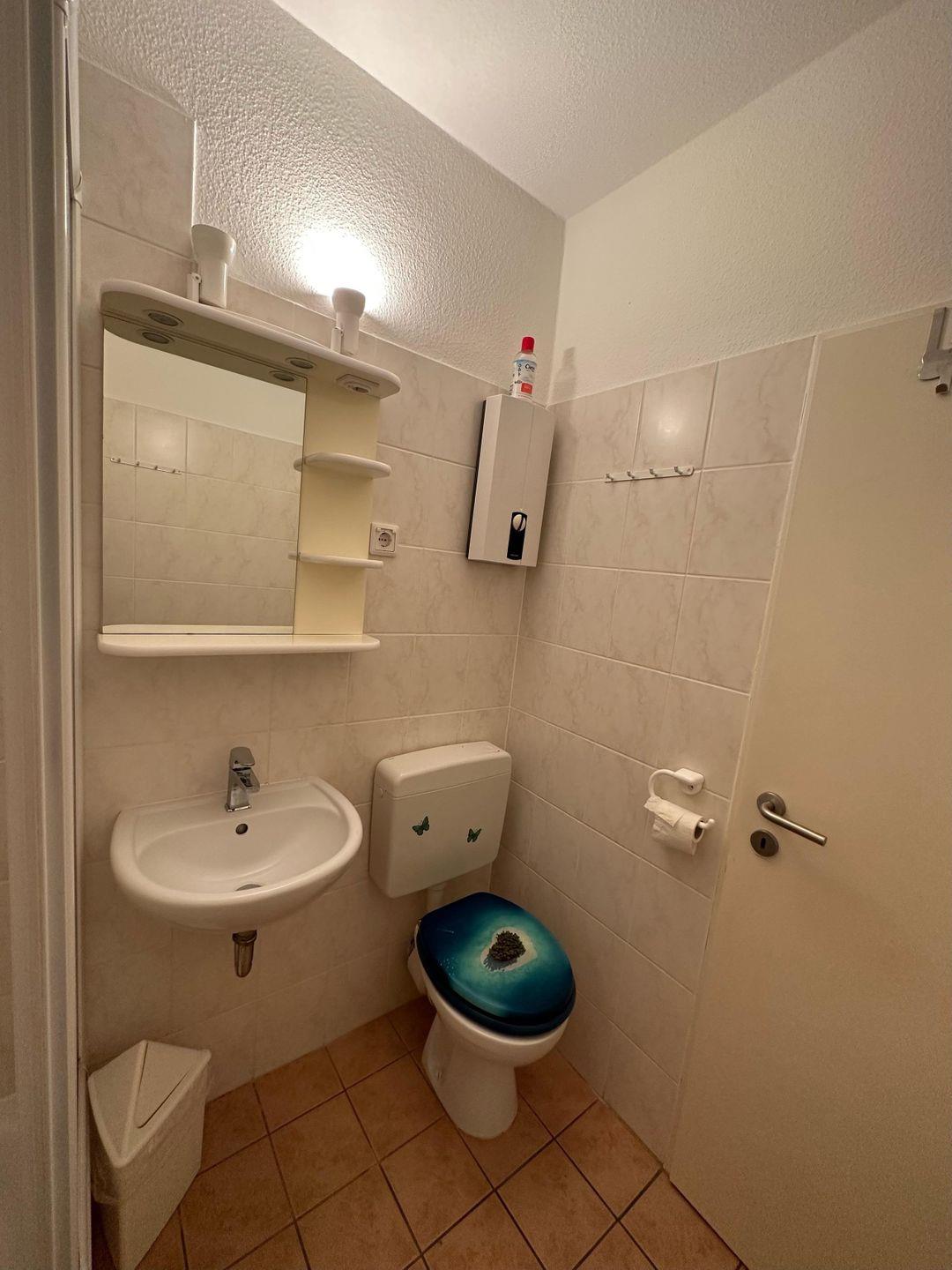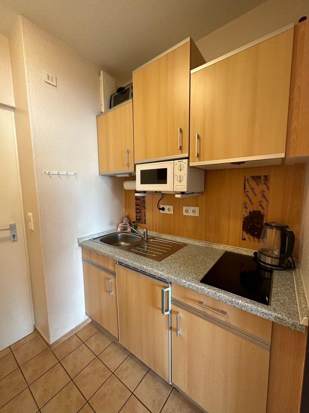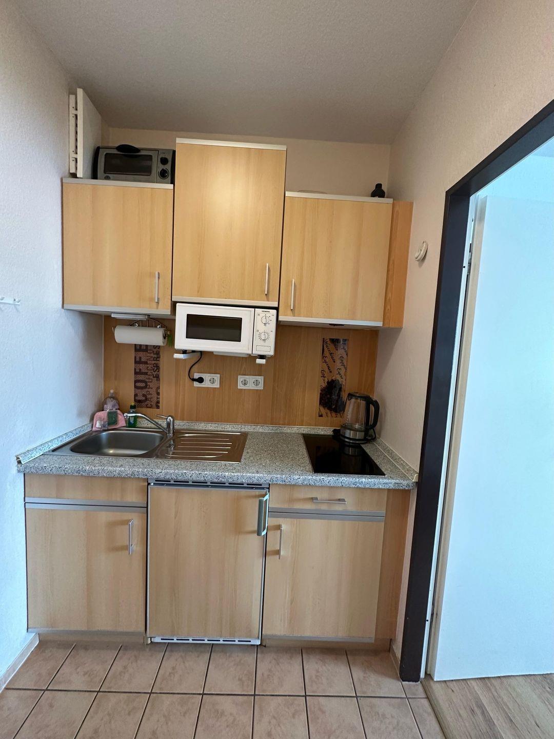 Die Küche ist mit einem 2-Platten Cerankochfeld, einer Mikrowelle mit Grill, einem Kühlschrank mit Gefrierfach und natürlich auch einem Wasserkocher und einem Toaster ausgestattet.