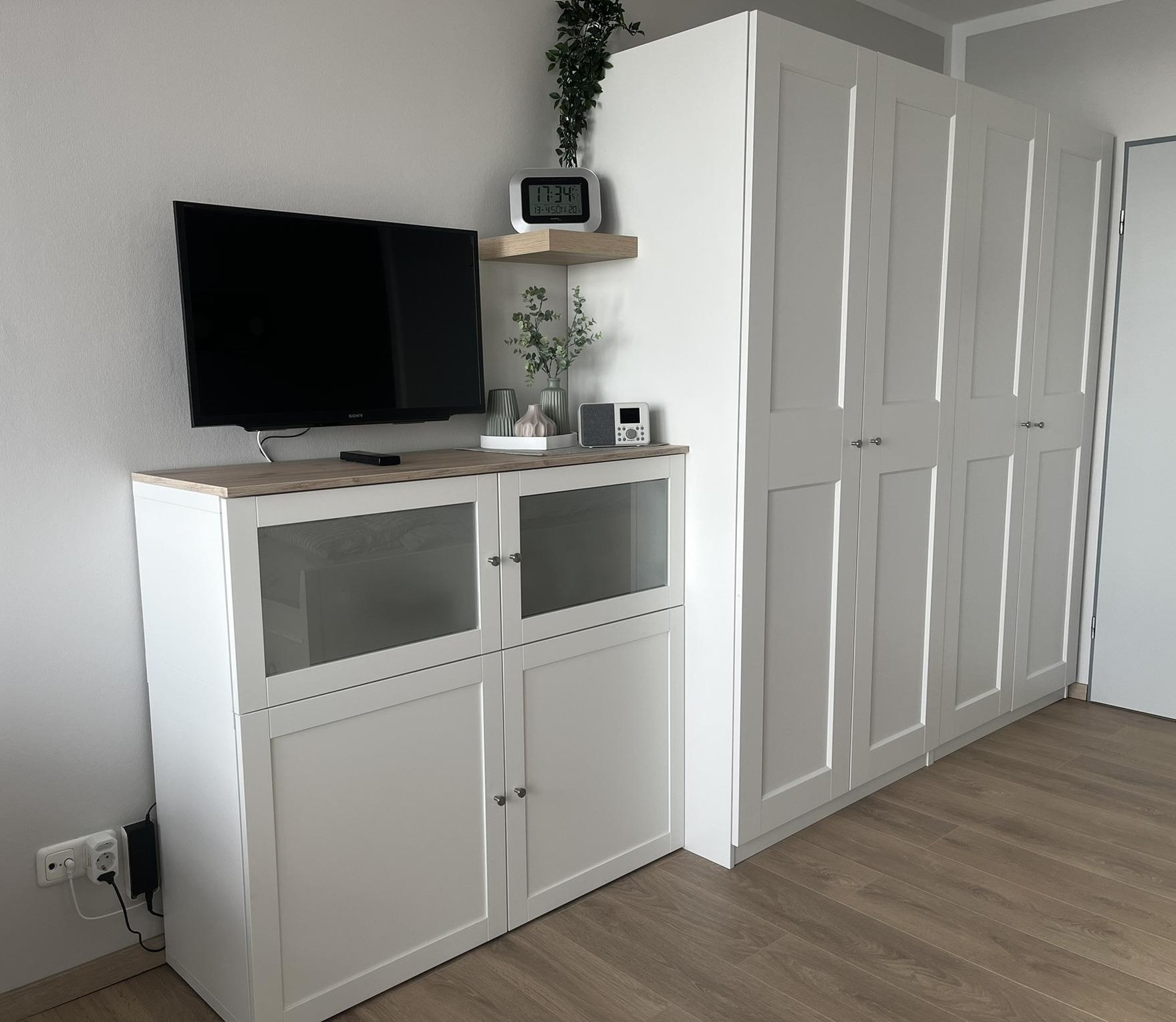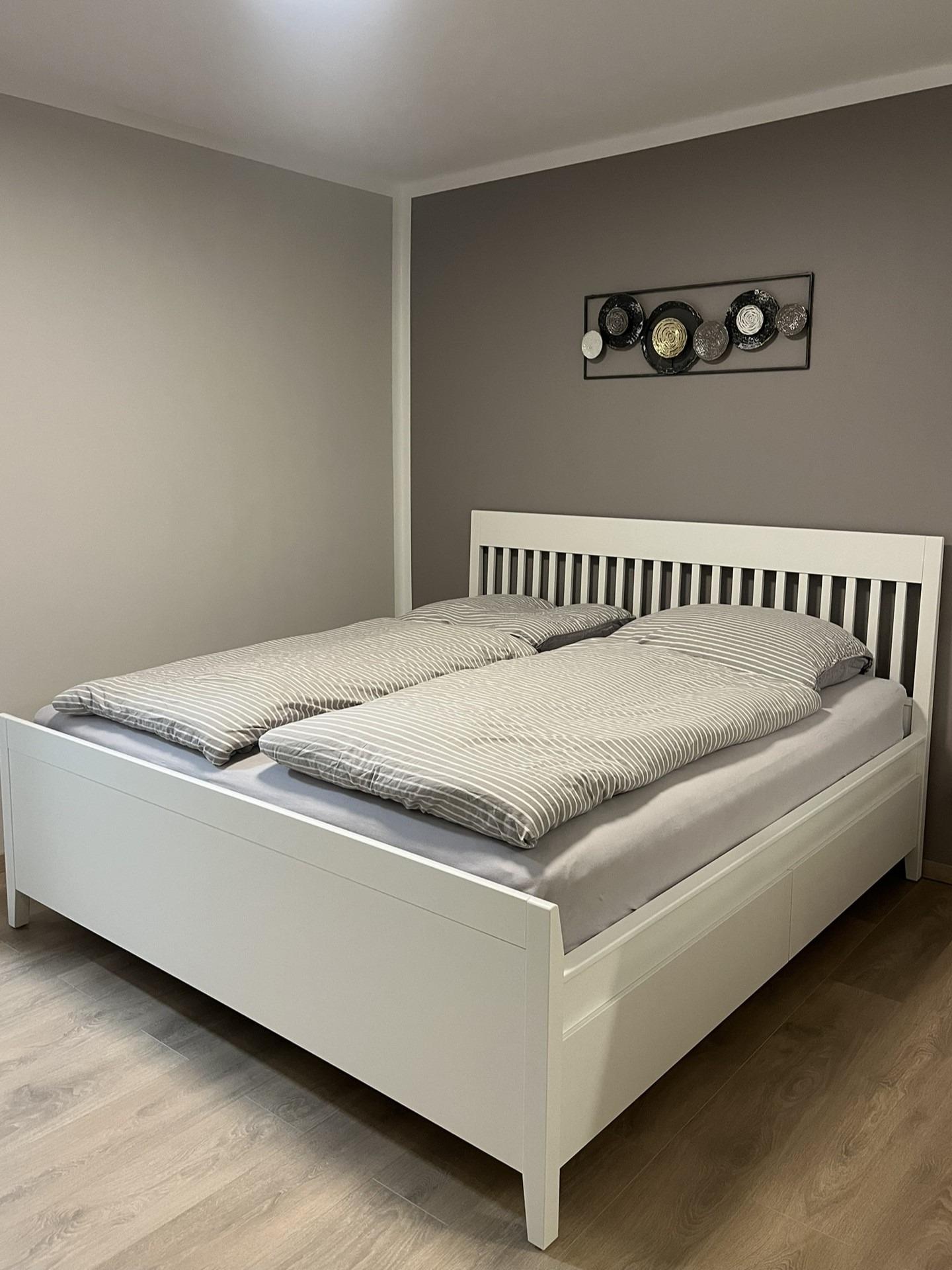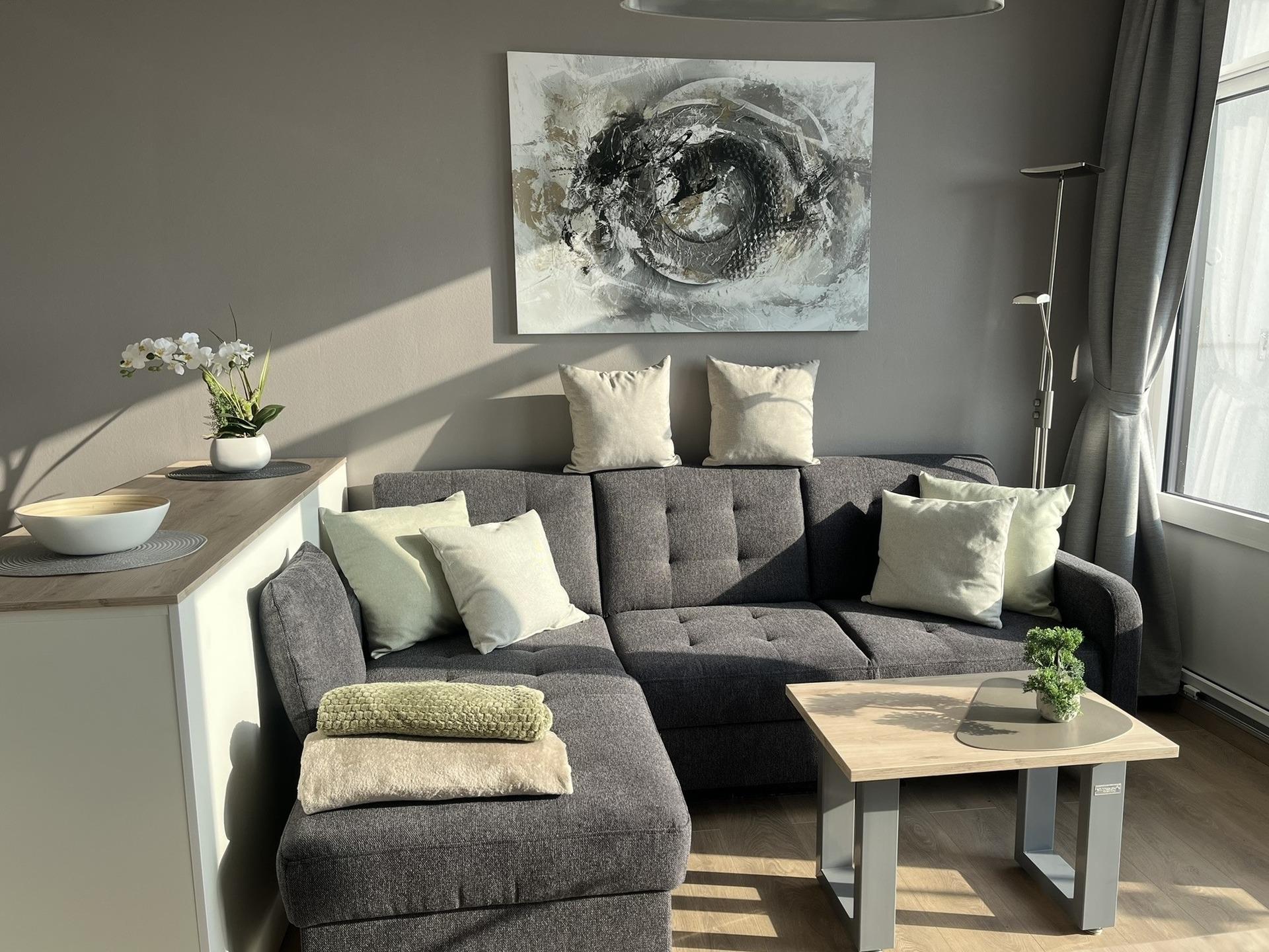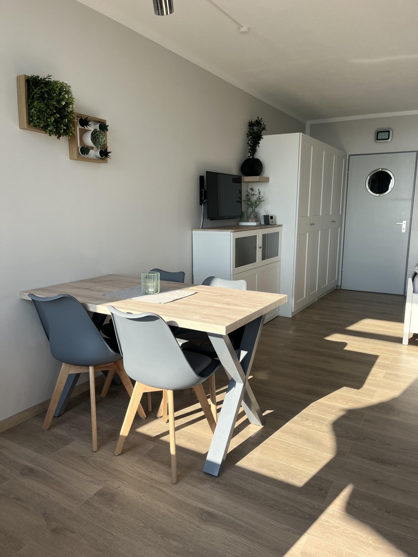 Hier können Sie auf bequemen Gartenstühlen romantische Sonnenuntergänge genießen. Die Wohnung mit einer Wohnfläche von 34qm verfügt über einen großen Wohn-, Essbereich mit herrlichem Meerblick, einem Smart-Fernseher und einem DAB+/Bluetooth Radio. Im Schlafbereich befindet sich ein großes Doppelbett mit guten Matratzen. Für den erholsamen Schlaf ist eine Insektenschutztür und Verdunklungsvorhänge an den Fenstern angebracht. Die Küche ist mit einem 2er Induktionsfeld, Dunstabzugshaube, Mikrowelle, Mini-Backofen, Kühlschrank mit Gefrierfach, Kaffeemaschine, Toaster, Wasserkocher, Eierkocher und viel Geschirr und Zubehör ausgestattet. Unser Bad wurde komplett neu mit Hänge-WC, Dusche (80x90cm) mit Echtglas-Duschwand, Waschtisch mit großem Spiegel und hellen Lampen renoviert und mit Badmöbeln ausgestattet. Die Wohnung ist allergikergerecht im Wohn-/Schlafbereich mit Laminat und im Flur-/Küchenbereich mit Fliesen ausgelegt. Sie finden in der Wohnung aus hygienischen Gründen keine Teppiche. Trotzdem hat die Wohnung ein freundlich-warmes Ambiente. Zur Wohnung gehört ein zugewiesener Parkplatz. In der näheren Umgebung finden Sie alles, was Sie für einen erholsamen Urlaub benötigen: Strandkörbe, Restaurants, Eisdiele, Bäckerei, Lebensmittelmarkt, Spielplätze, Trampolinanlage, Beachsoccerplatz, Tourismus-Information, Fitnessstudio, Quarkeria, Waschsalon, Yachthafen, Meerwasserwellenbad (Fehmare).