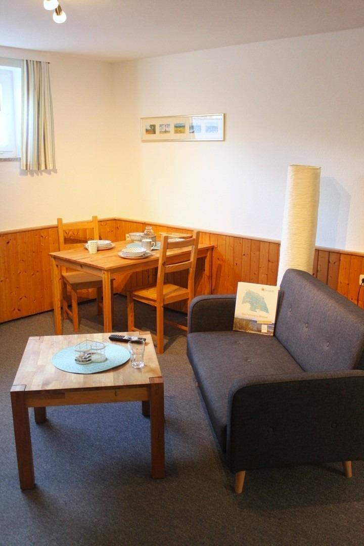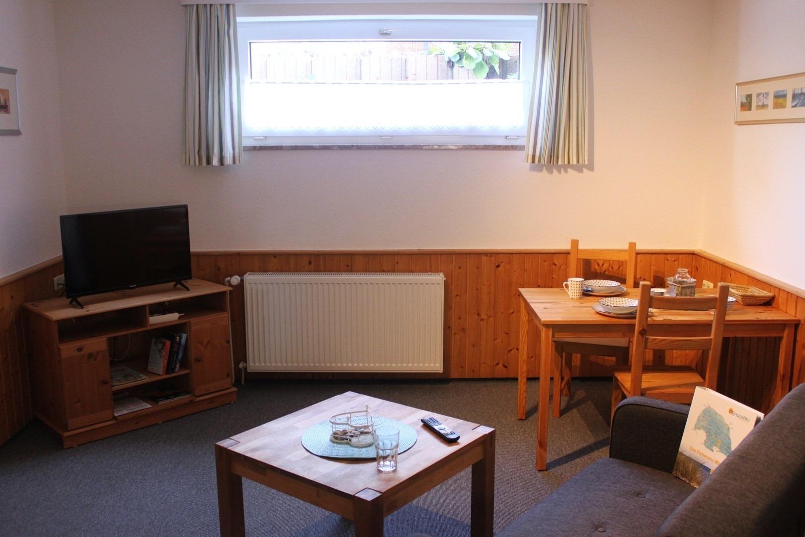 Die Ferienwohnung im Souterrain ist aufgeteilt in einen Wohnschlafraum mit einem großen Doppelbett, ein gemütliches Sofa, sowie einer Fernsehecke. Von hier aus gelangt man über das moderne Eßzimmer in die kleine Küche.