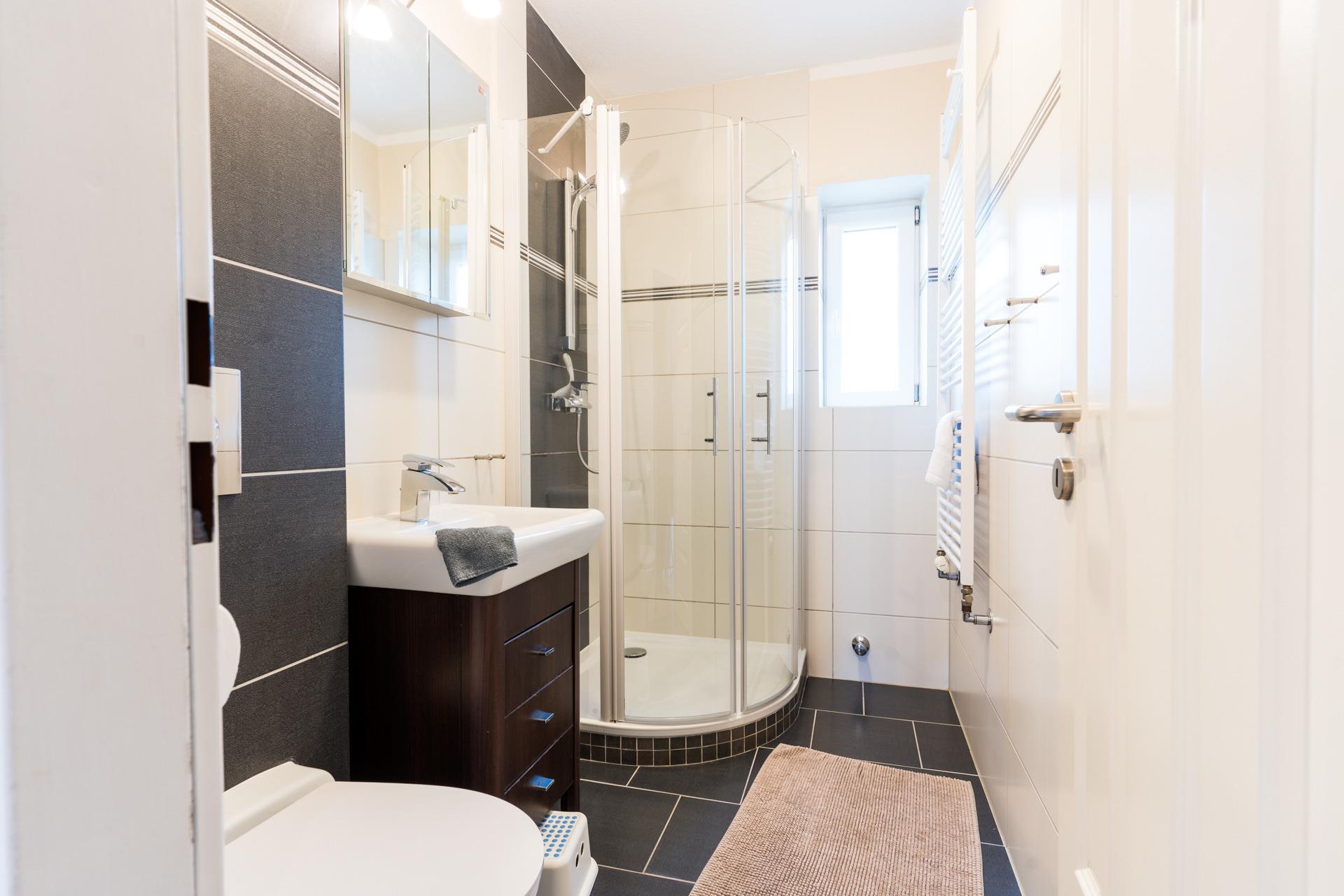 Das moderne Badezimmer mit Dusche verfügt über einen Handtüchheizkörper.
