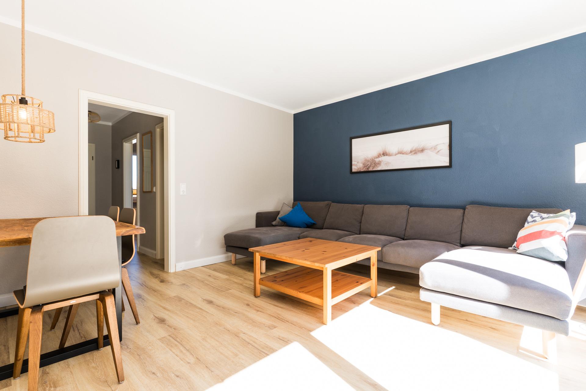 Im lichtdurchfluteten Wohn-Esszimmer erwarten Sie ein Flachbid-TV mit DVD-Player, ein Radio und ein CD-Player.