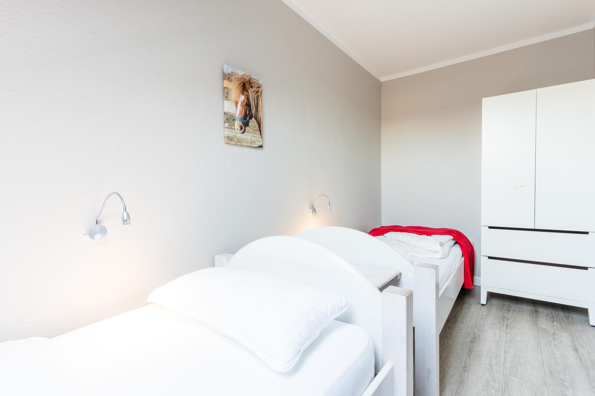 Ein Schlafzimmer mit 1 Doppelbett und ein Kinderzimmer mit 2 Einzelbetten befinden sich im Obergeschoss, ebenso ein Badezimmer mit Dusche.